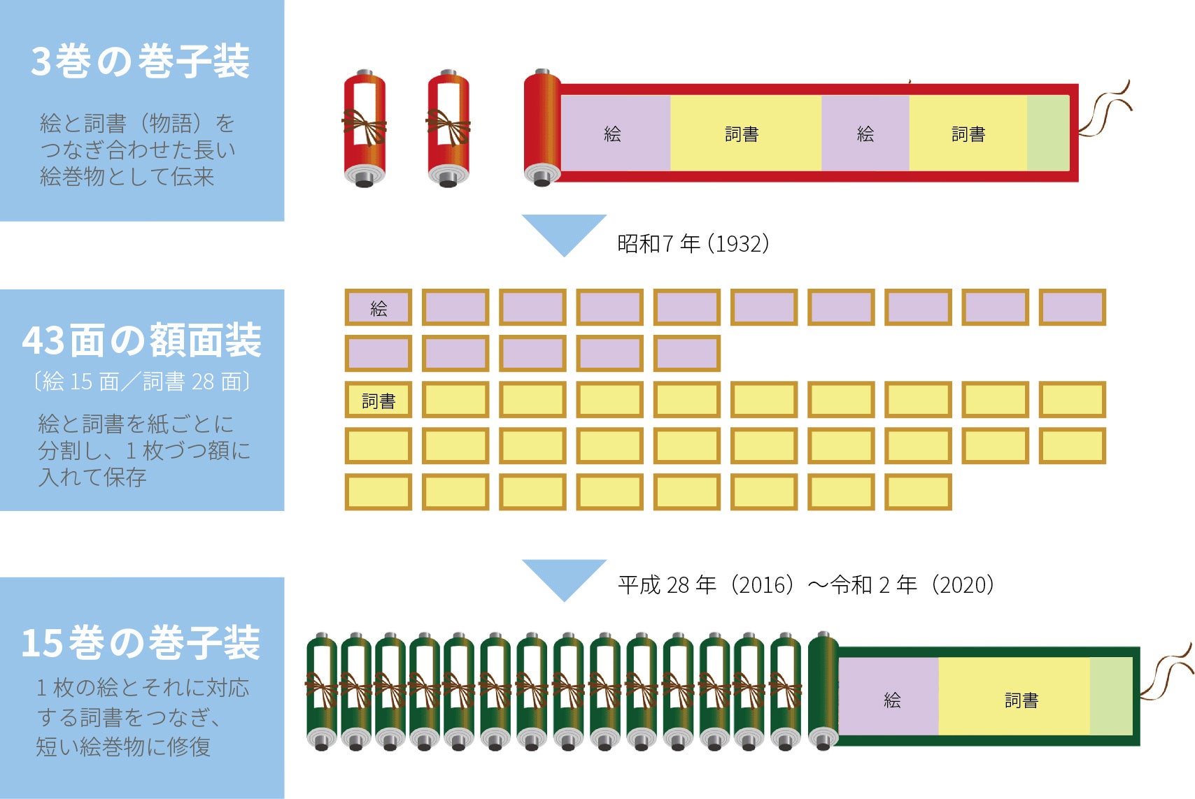 この巻子装(巻物状)の国宝「源氏物語絵巻」は、昭和7年(1932)に紙の繋ぎ目を剥がして15枚の絵と28枚の詞書に分け、43面の額面装(額に入れた状態)に改装されます。平面で保存する方が作品に負担がかからないという、当時としては最善の判断でしたが、80余年を経て額面装による弊害が生じてきました。