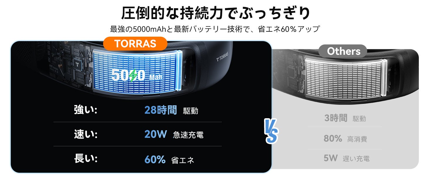 • 5000mAhバッテリー搭載で最大24時間の長時間使用が可能