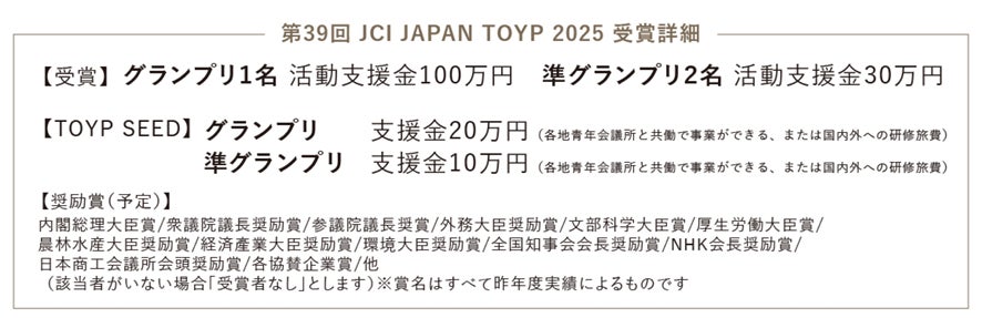 厳正なる審査の上、受賞者の方々には受賞イベントの参加やメディア露出、フォーラムでの講演など活動の域を広げる機会を提供し、さらに受賞者の中から日本代表候補者として2026年のJCI TOYPに申請をいたします。