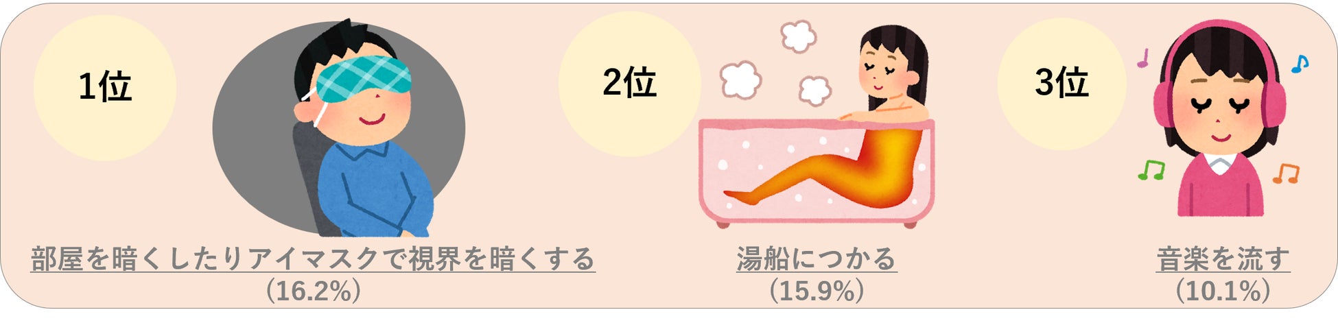 寝つきを良くするために行っている睡眠ケアについて問う設問では、「部屋を暗くしたりアイマスクで視界を暗くする」という回答が16.2%で第一位に。
