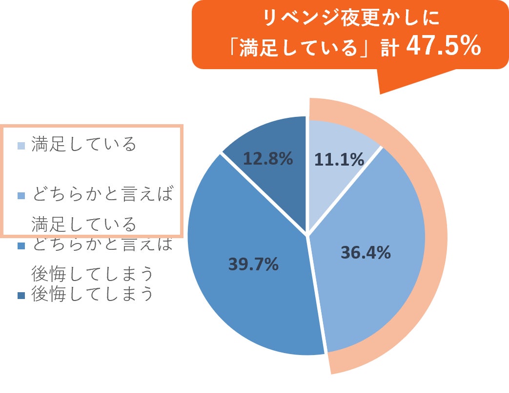 「リベンジ夜更かし」派は、楽しみの時間を作れた「リベンジ夜更かし」に満足している一方で、半数以上が「リベンジ夜更かしをした日は寝つきが悪い」と寝つきには課題感を感じている。