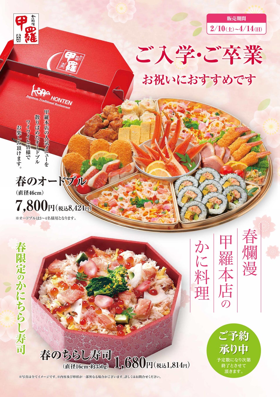 株式会社甲羅(本社:愛知県豊橋市、代表取締役:坂元 正明)が全国で40店舗展開している老舗かに料理専門店「甲羅本店」では卒業・入学シーズンや春のイベントごとに向けて「春のオードブル」「春のちらし寿司」を予約受付中です。※一部店舗を除く