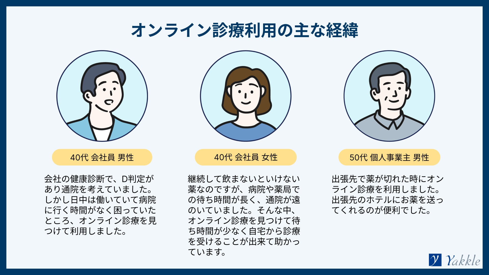 日中は忙しく通院が難しい方、病院や薬局での待ち時間が長く治療を中断していた方、また、出張先で薬が切れてしまった方など、ヤックルの利用患者から多くのエピソードが寄せられています。オンライン保険診療は、自宅や出張先など、医療アクセスが不自由になってしまう場面でも、治療を継続できる環境を提供しています。