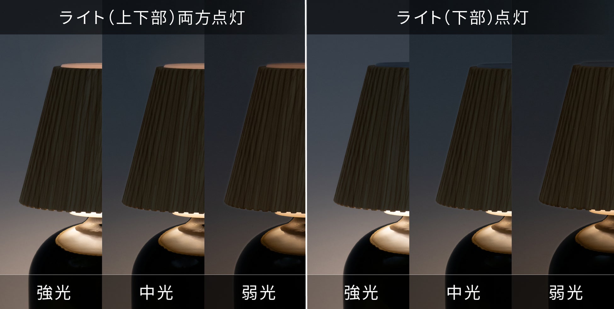 本製品は、「上下部両方」と「下部だけ」の点灯を選択することができ、それぞれの点灯モードで強光・中光・弱光の3段階の明るさ設定が可能です。シーンに合わせて好みの明るさに調節することができます。
