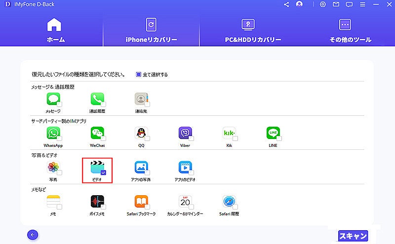 ステップ 3:復元したい項目の「ビデオ」にチェックを入れて、右下の「スキャン」をクリックします。