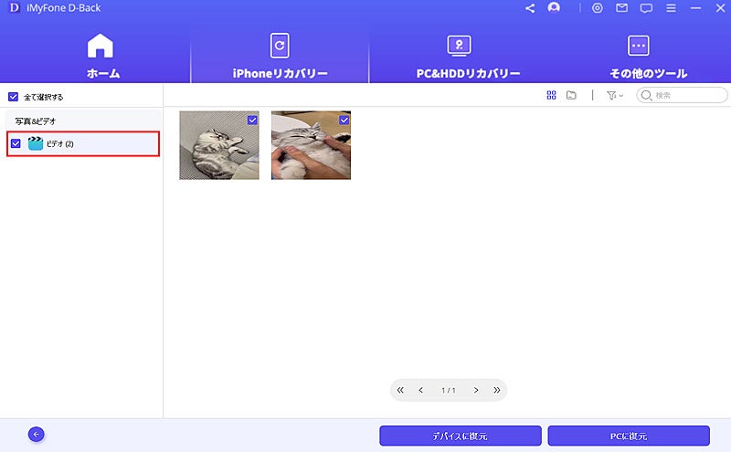 ステップ 4:結果画面で復元したい動画を選択して、右下の「デバイスに復元」ボタンをクリックすれば、iPhoneから完全削除した動画は直接デバイス本体に復元されます。