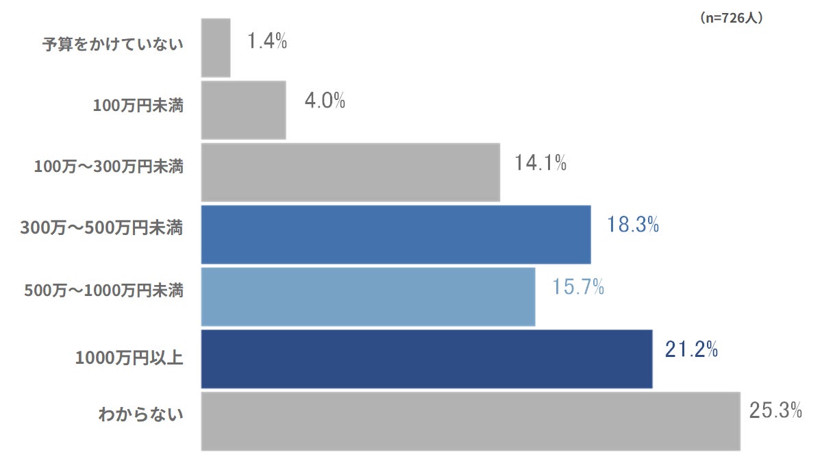 人的資本価値向上に向けた取り組みとして、人材育成や従業員エンゲージメントなどの分野でeラーニングを導入している企業も多い中、その年間予算では、「1000万円以上」が約2割と最も多い結果となりました。次いで「300万~500万円未満」「500万~1000万未満」が続き、これらの層を合わせると全体の約半数を占めており、一定の投資を行っている企業が多いことが示されました。