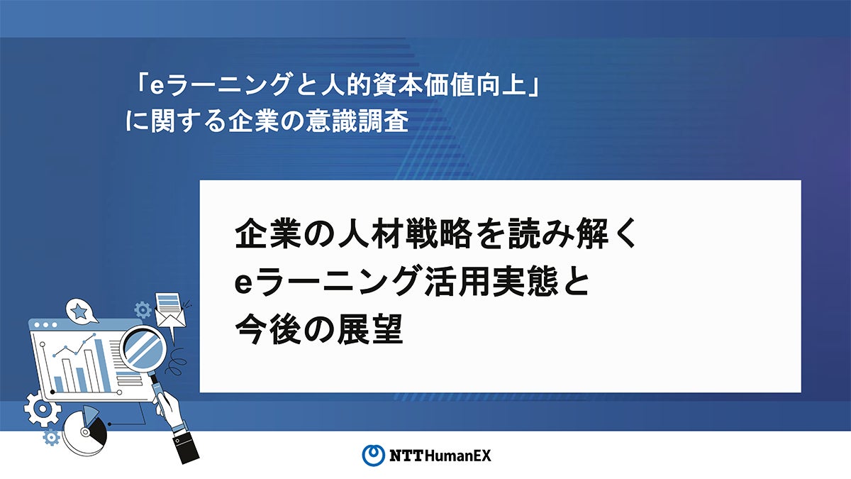 NTT HumanEXでは、「エンゲージメント向上を支援するDXソリューション・パートナー」としてヒューマン・キャピタル分野のソリューションを通じ、お客様の経営課題を解決し、組織効果へとつなげる様々なお手伝いをしております。今回実施しました調査は、人的資本開示やeラーニング活用を取り巻く課題や傾向を明らかにし、企業の施策検討に活用いただくことを目的としています。今後の人的資本戦略の推進や教育投資の効果的な設計に向け、ぜひ本調査結果をご活用ください。詳細なレポートは下記リンクよりダウンロード可能です。ぜひご覧ください。
