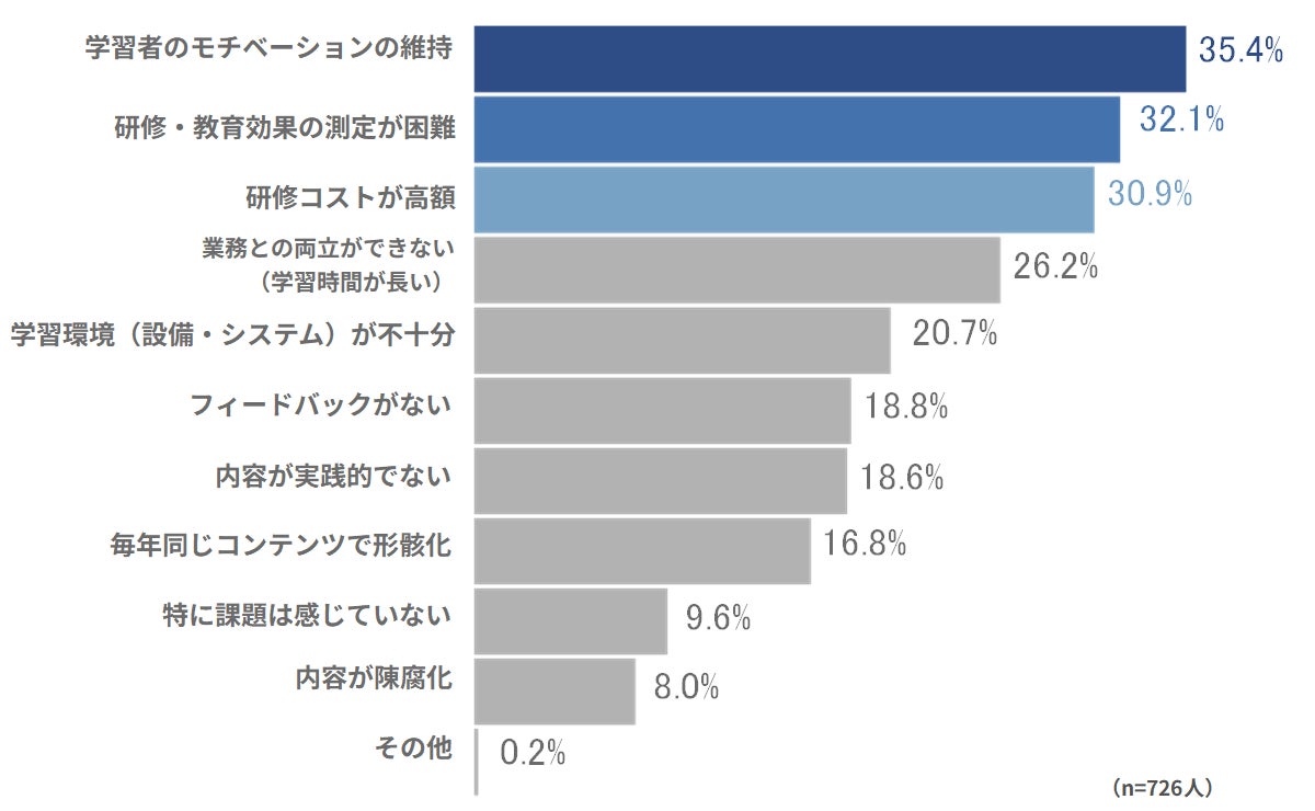 eラーニングにおける課題として、「学習者のモチベーションの維持」(35.4%)が最も多く挙げられました。学習者任せの状態が成果に直結しにくいとの課題感が浮き彫りになっています。また、「教育効果の測定が困難」(32.1%)、「研修コストが高額」(30.9%)といった声も多く、効果検証や費用対効果の観点から、十分に設計・評価されていないケースがあることも明らかになりました。