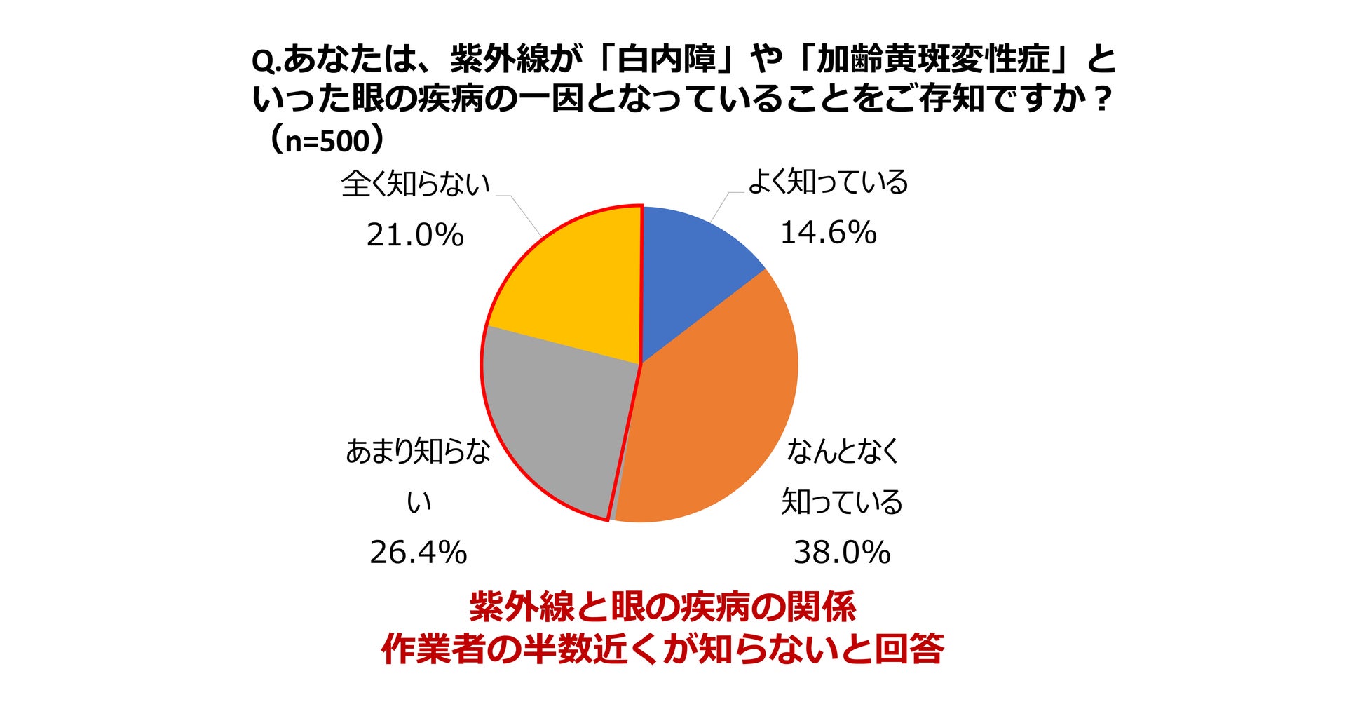 紫外線は、白内障や加齢黄斑変性症といった眼の疾病の一因とされています。これについて「よく知っている」と回答した方は14.6%で、「なんとなく知ってる」が38.0%という結果となりました。 一方で「全く知らない」と回答した方は21.0%で、 「あまり知らない」と回答した26.4%と合わせると、47.4%と半数近くの方が紫外線の影響を知らずに、普段作業を行なっている実態も明らかになりました。