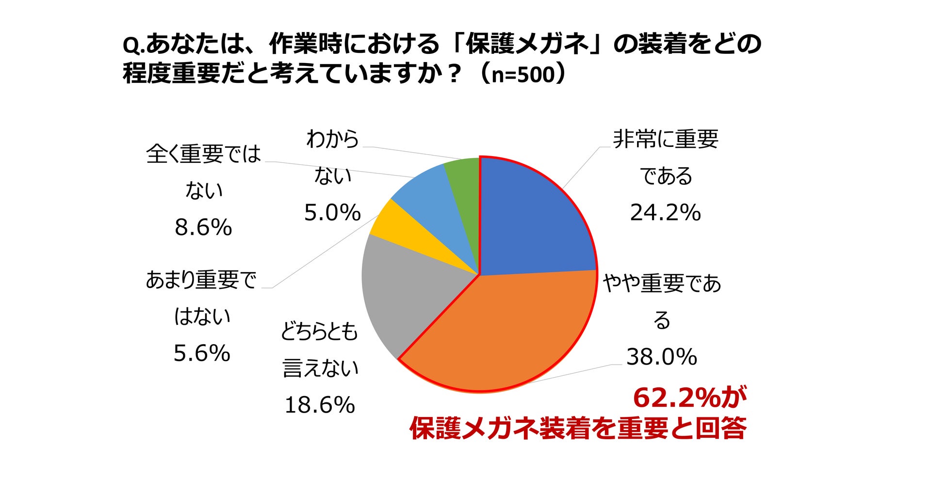 作業時における保護メガネの装着をどの程度重要だと考えているかを聞いたところ、「非常に重要である」と回答した人は24.2%で、「重要である」と回答した38.0%と合わせると、全体の62.2%が重要だと考えていることがわかりました。