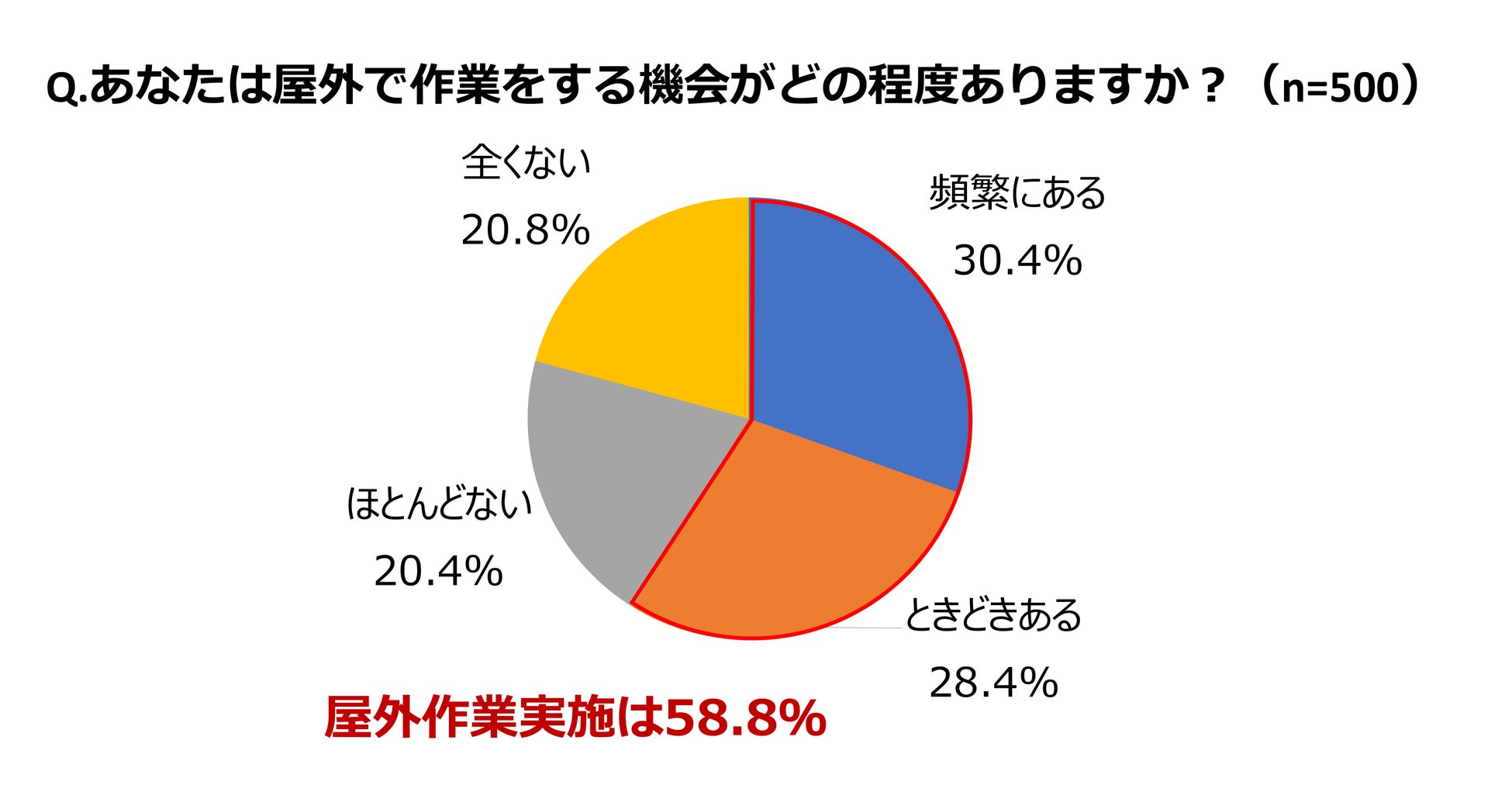 また、調査では紫外線対策が不十分であることも、深刻な問題として浮かび上がりました。約半数の作業者が紫外線の弊害を認識せずに作業している実態が明らかになり、特に屋外作業者における紫外線対策の不足は、長期的な健康リスクにつながる可能性があります。作業者への紫外線対策の重要性の周知を強化するとともに、適切な保護具の提供を行う必要があります。