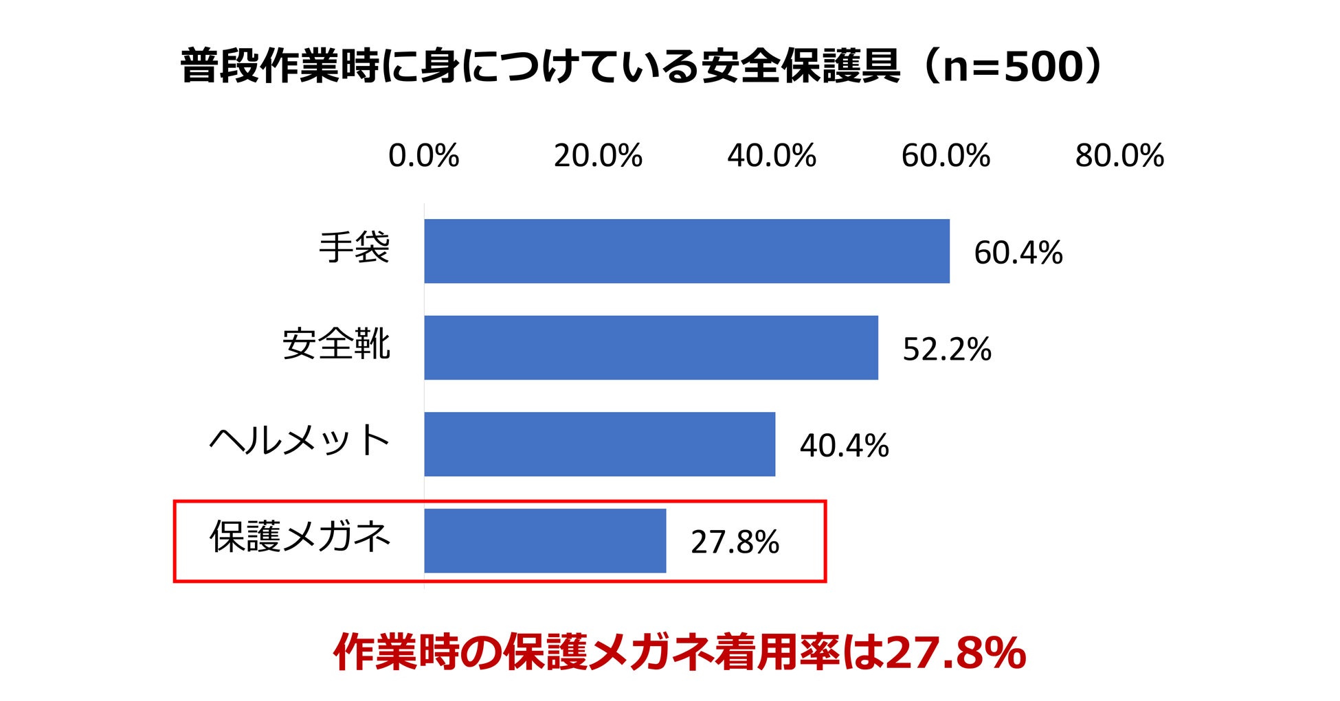 - 作業者の保護メガネ着用状況についての実態調査 – 保護メガネの重要性を62%が実感も、着用率は28%にとどまる 着用していない理由最多は「社内ルールに定められていないから」27%
