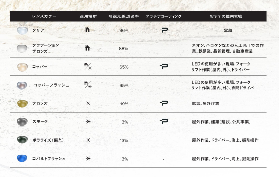ボレー・セイフティの保護メガネは、作業者の眼の健康を考え、全ラインアップで紫外線を99.9%カットする特殊レンズを使用しています。また作業効率を考慮し、デザイン・用途別に可視光線透過率から選べる複数のカラーレンズを提供しています。