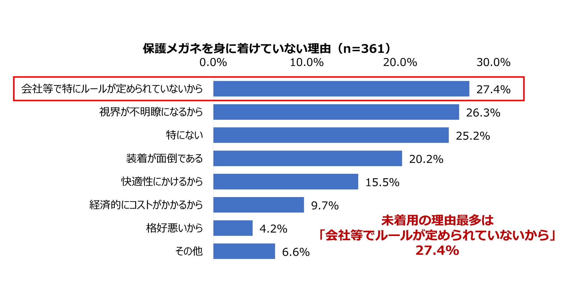 また保護メガネを普段身に着けていないと回答した361名に、その理由を聞いたところ、最も多かったのは「会社等で特にルールが定められていないから(27.4%)」で、次いで「視界が不良になるから(26.3%)」、「特にない(25.2%)」と続きました。