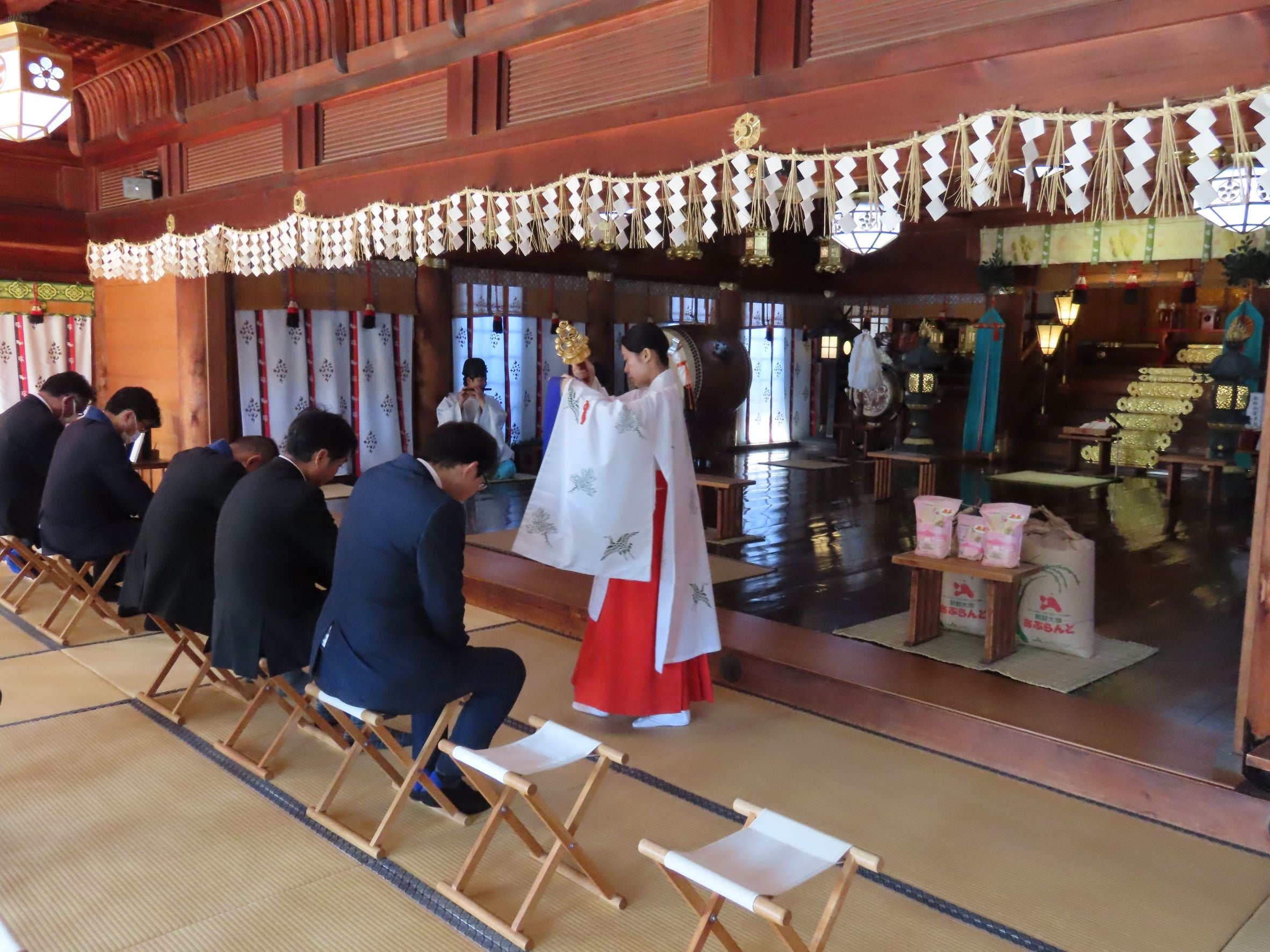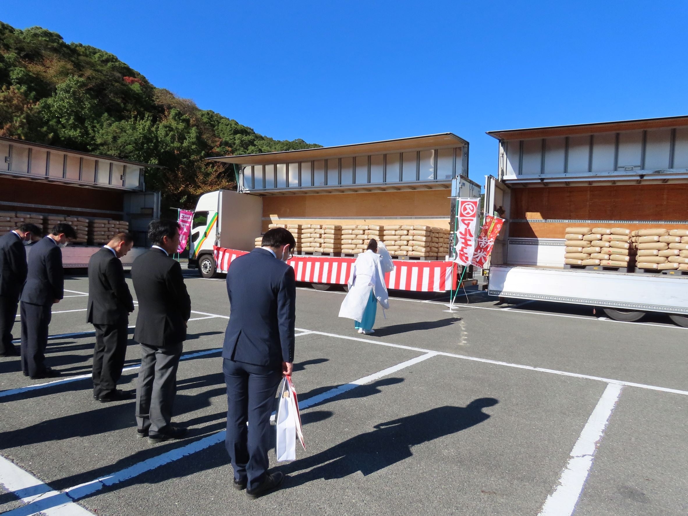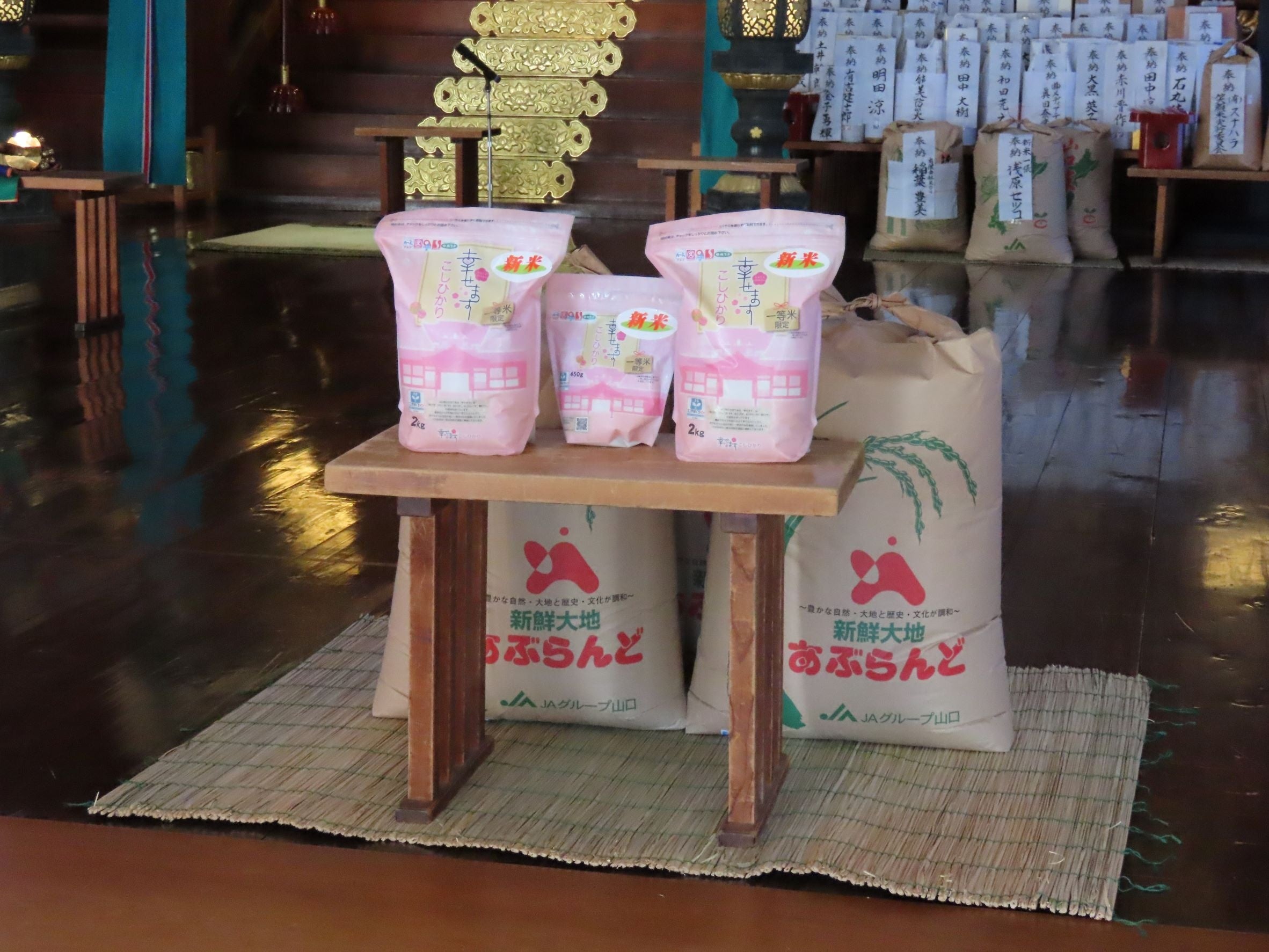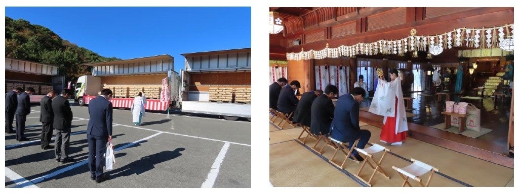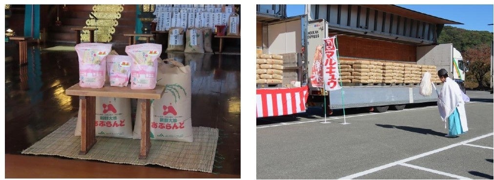今回は、10月28日(土)より丸久グループ全店で販売する予定のお米、玄米43.11トンを祈祷していただきました。こちらの商品は、2kg入りと450g(約3合分)の2つのタイプをご用意しております。(一部取扱いのない店舗もございます)