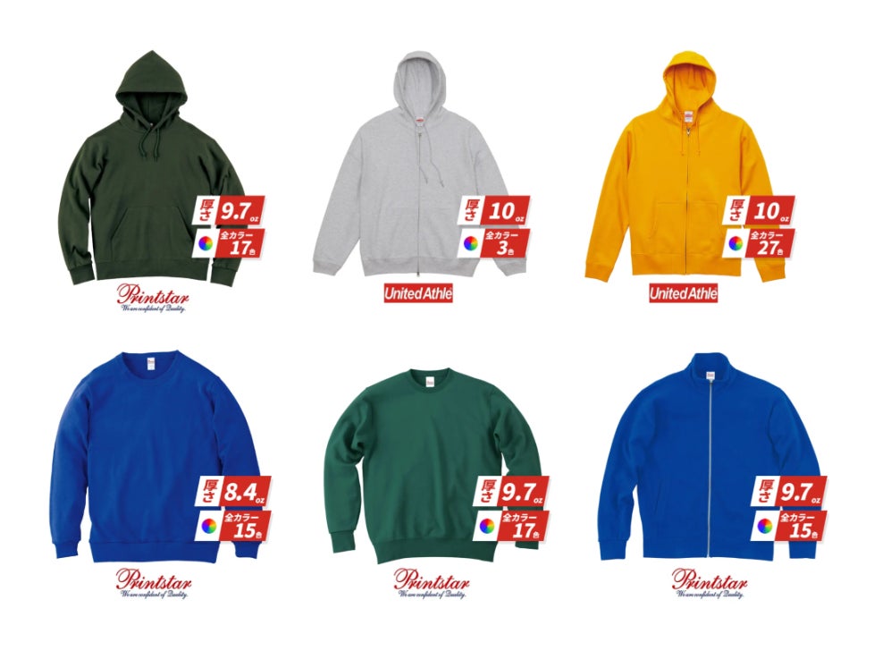 寒い季節に欠かせないパーカーやスウェットは、ゆったりとした着心地と防寒性が魅力。オリジナルデザインで個性を表現しながら、イベントグッズや企業の販促品としても幅広く活用できます。
