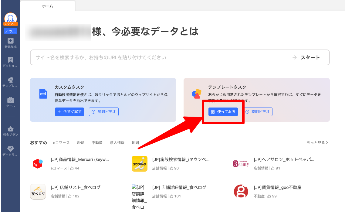 Octoparseの公式ウェブサイトからソフトウェアをダウンロードしてインストールします。ホーム画面の左上にある「新規作成」をクリックし、表示されたメニューから「テンプレートタスク」をクリックしてください。