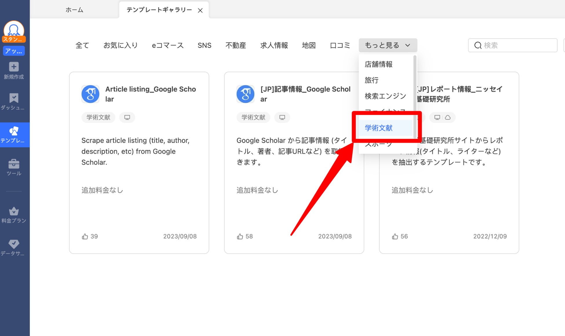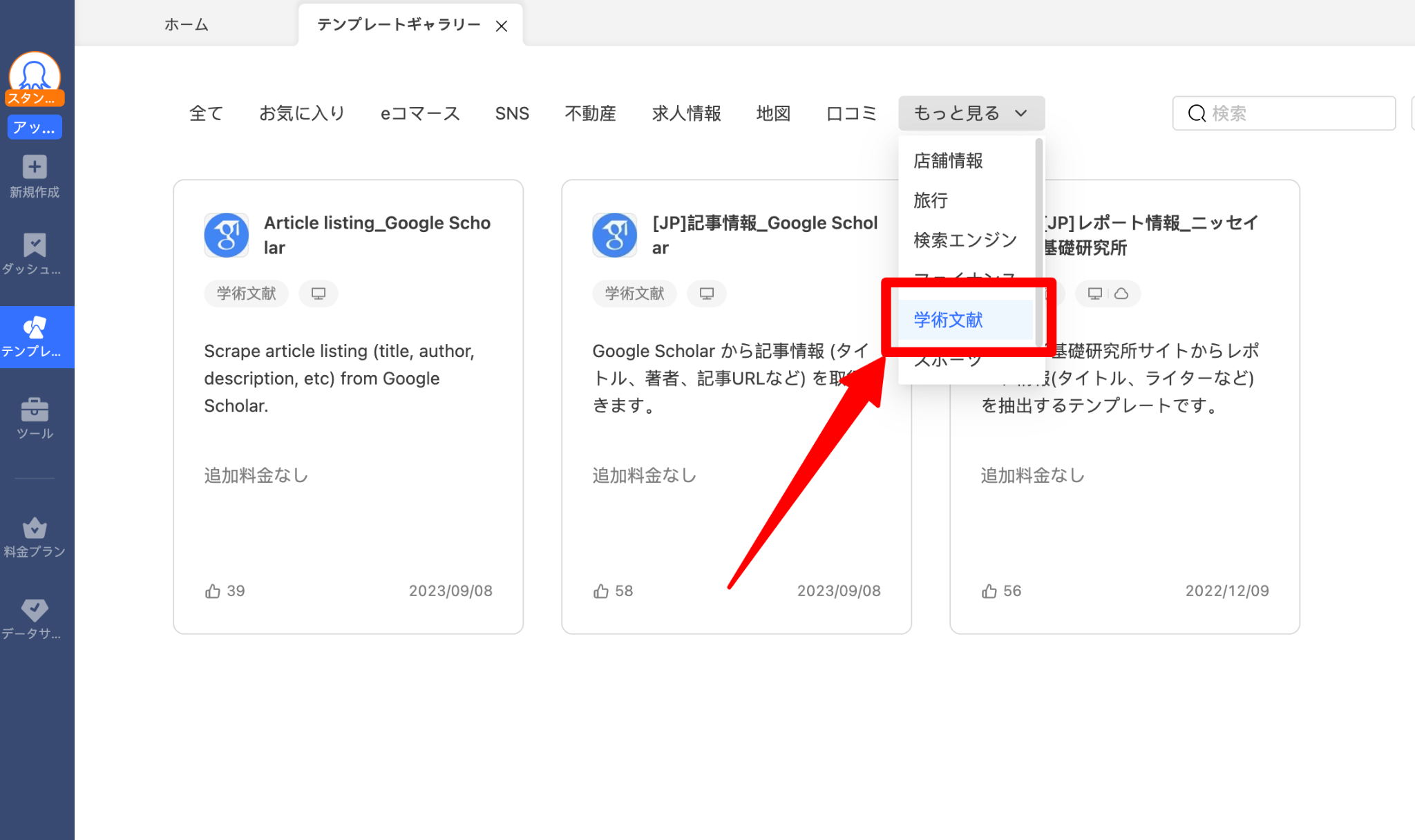 次にカテゴリーで「学術文献」をクリックします。すると、学術文献関連のテンプレート一覧が表示されるので、その中から「[JP]記事情報_Google Scholar」を選択します。