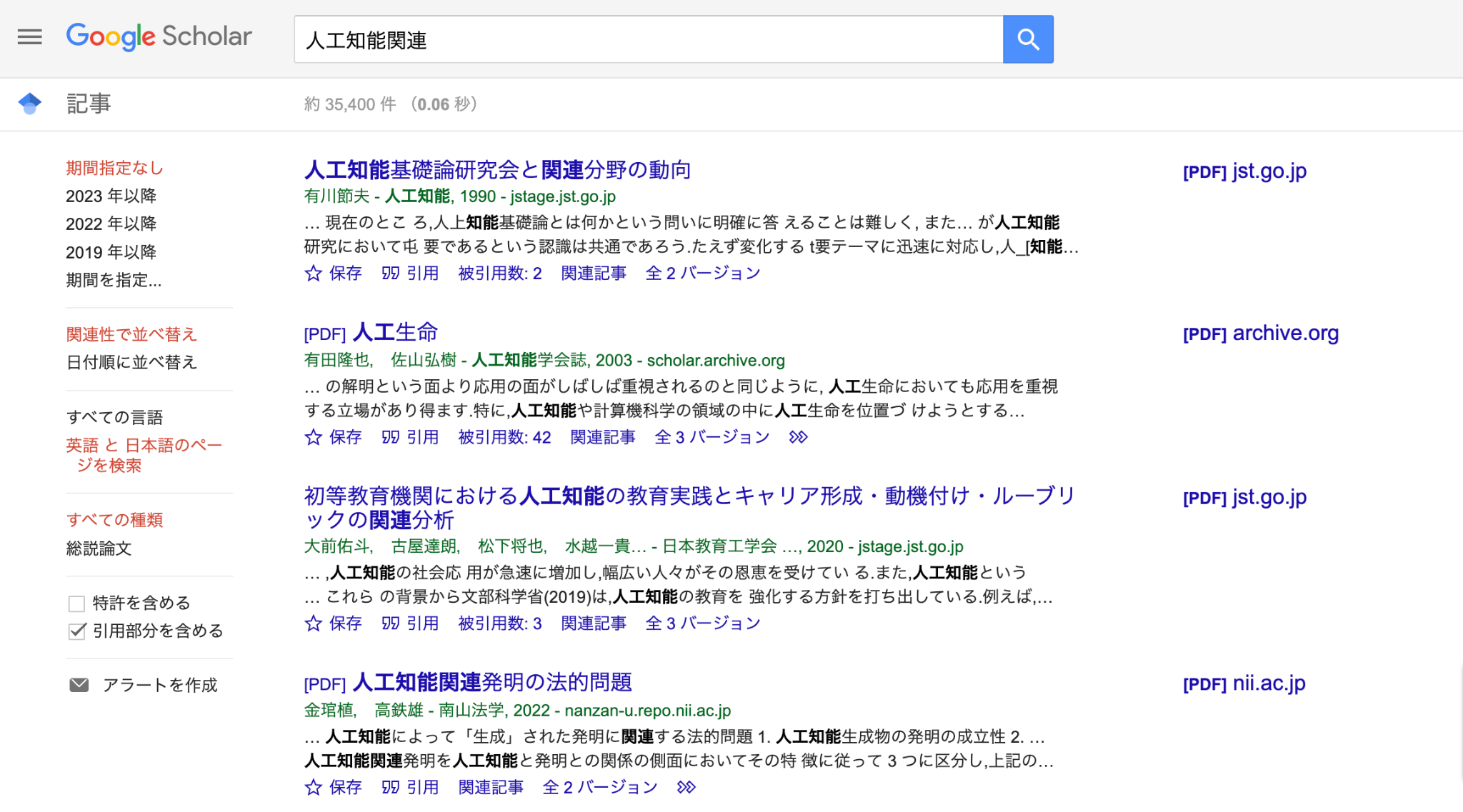 Google Scholarにアクセスします。キーワードを入力して、気になる学術文献をクリックする。(ここでは「人工知能関連」と検索します)。