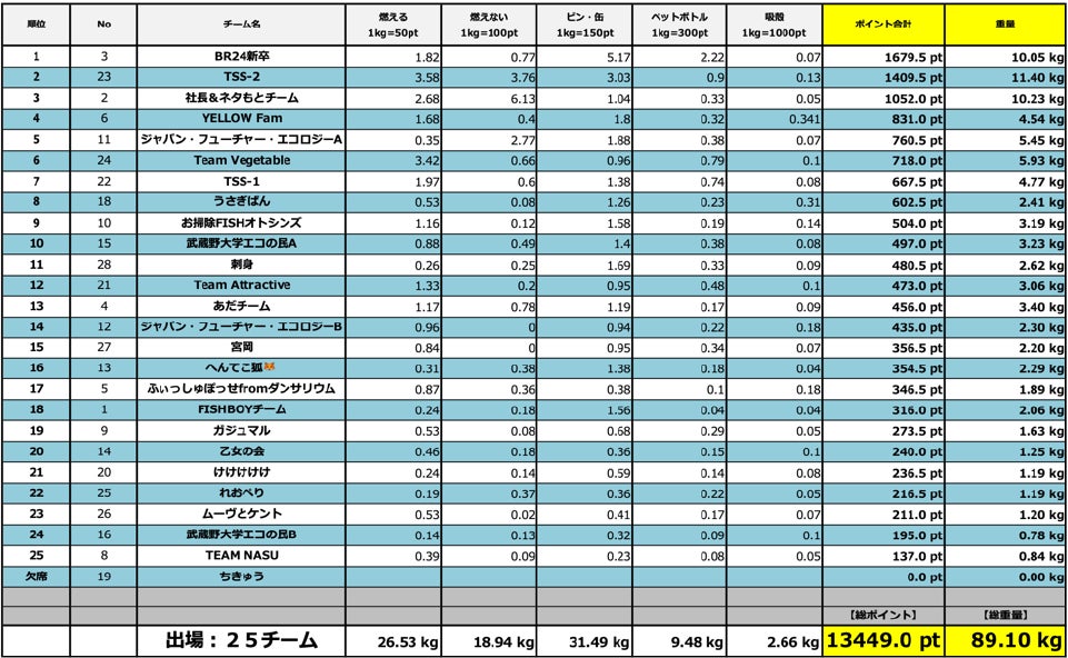 開催当日は1時間という短い時間にも関わらず、総重量89.10kgものゴミを回収することができました。渋谷区では2023年度、4月~10月の累計58,111tものゴミが回収されています。※2参加した25チームが、渋谷区の指定範囲内において積極的に競技に参加いただいたことで、当社の想い入れのある渋谷区内のクリーンアップに、微力ながら貢献ができたことを誇りに思います。