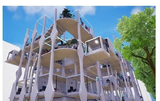 今回、「フォートナイト」に再現したのは、第17回最優秀賞作品である、京都大学 南沢想さんの「電気の森,水道の川に住む」です。電気や水道といった都市の資源を自然の環境資源のように利用しながら、人と人が自然と「まざりあう」他者と共生する集住体をコンセプトにしています。