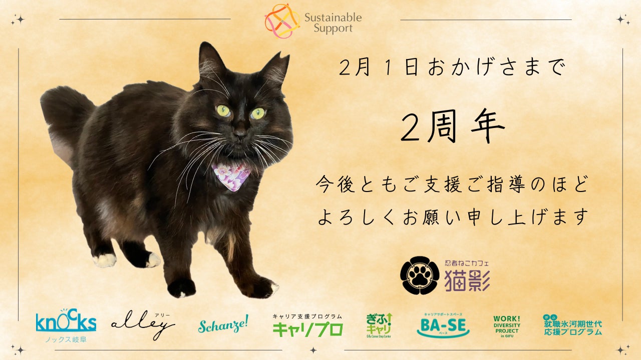 平素より、忍者ねこカフェ「猫影」を温かく見守り、ご支援いただき、心より感謝申し上げます。おかげさまで、猫影は2月1日をもちまして2周年を迎えることができました。