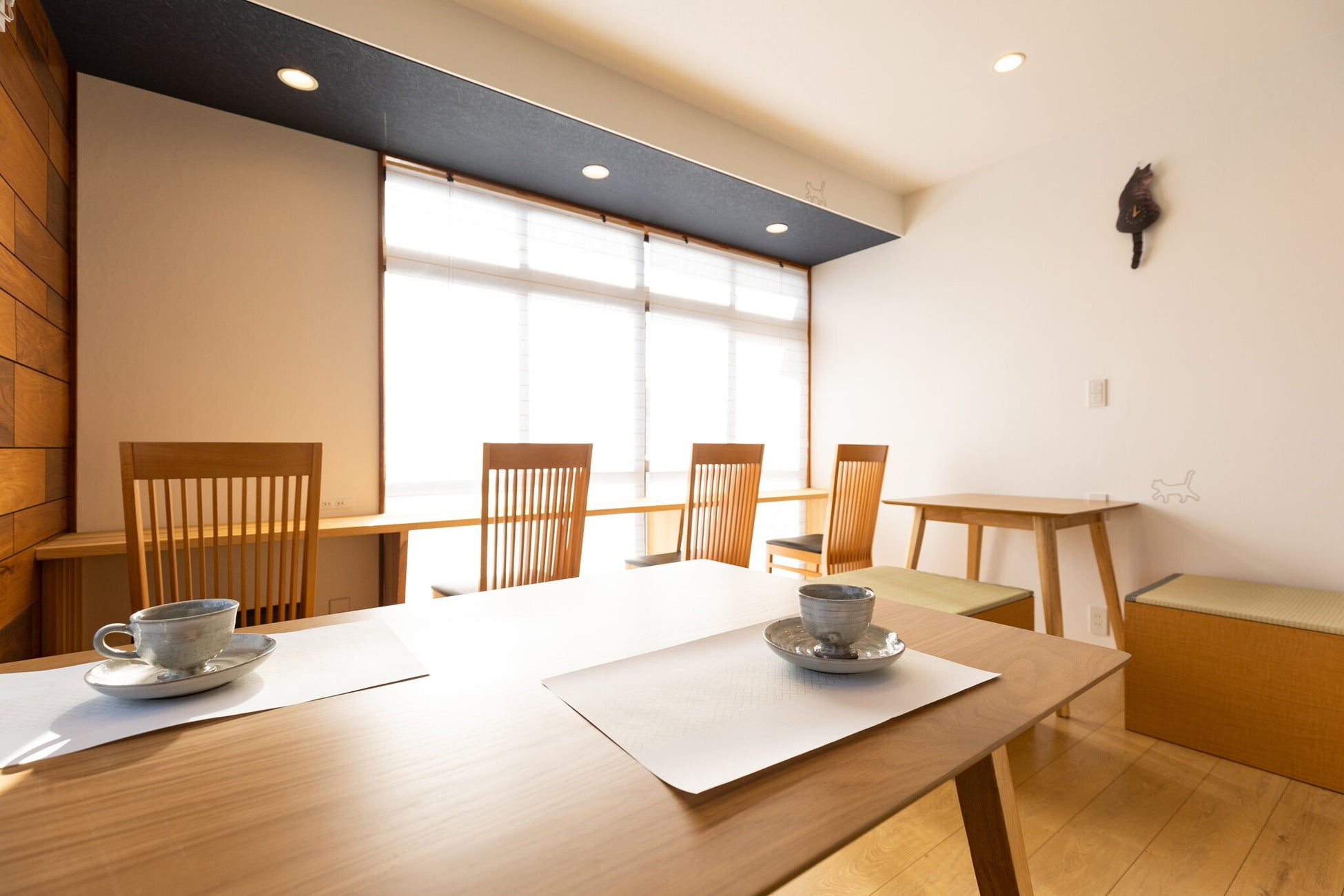 忍者屋敷をイメージした和風猫カフェとなっております。どんでん返しや壁一面のキャットウォークなど、お客様もねこ達も楽しめる場所です。