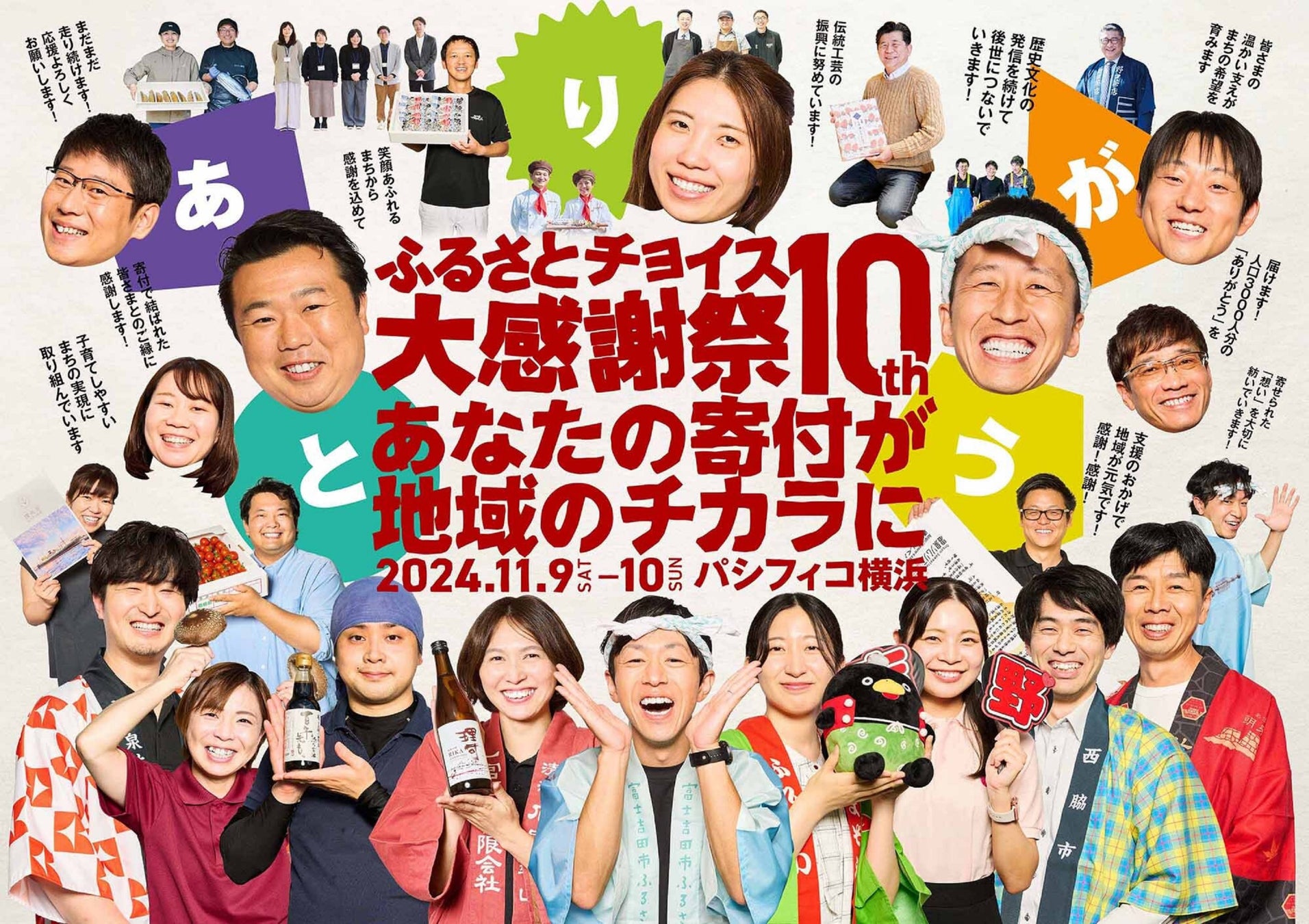 「ふるさとチョイス大感謝祭」は、自治体や地域の事業者・生産者が寄付者に感謝を伝えることをコンセプトに毎年開催し、今年で10回目を迎えます。今回は「あなたの寄付が地域のチカラに」をテーマに、お礼の品となっている特産品の魅力を伝えるだけでなく、寄付の使い道を来場者へ発信することで、地域に貢献していることを実感していただき、地域のファンになってもらい関係・交流人口創出につなげることを目的としています。