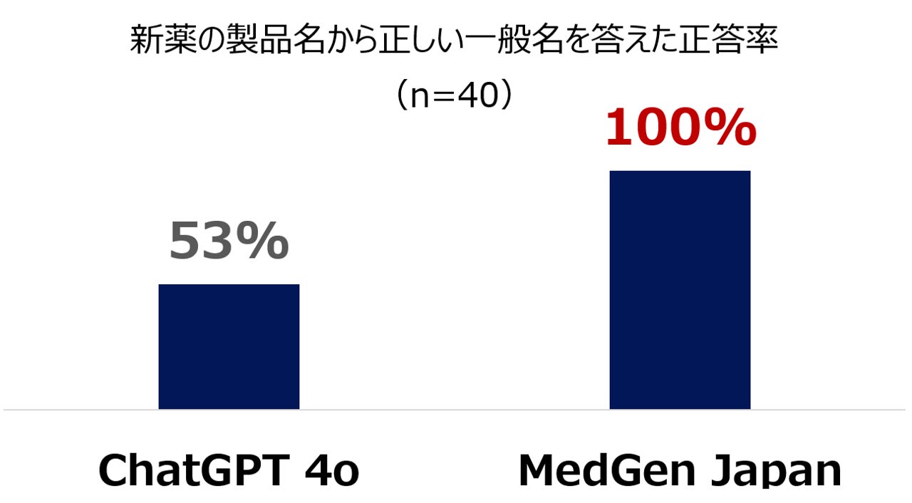 自社内のテストでは、直近に上市された40の新薬において、複雑な文章(薬剤名に似た別単語など、紛らわしい単語が入った文章)から薬剤名を検知して一般名に変換するタスクを用いて精度の検証を行いました。