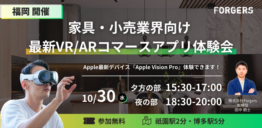 多くの家具・小売業者にVR/AR SaaSを提供中の㈱Forgersが、2024年10月30日(水)に福岡にて、Vision Pro・Quest 3のコマース向けVR/ARデモアプリ体験会を開催します
