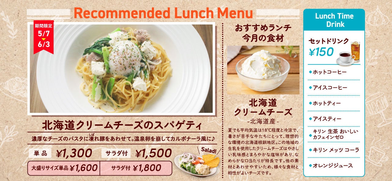 ●期間限定おすすめランチ:北海道クリームチーズのスパゲティ 1300円、大盛り1600円