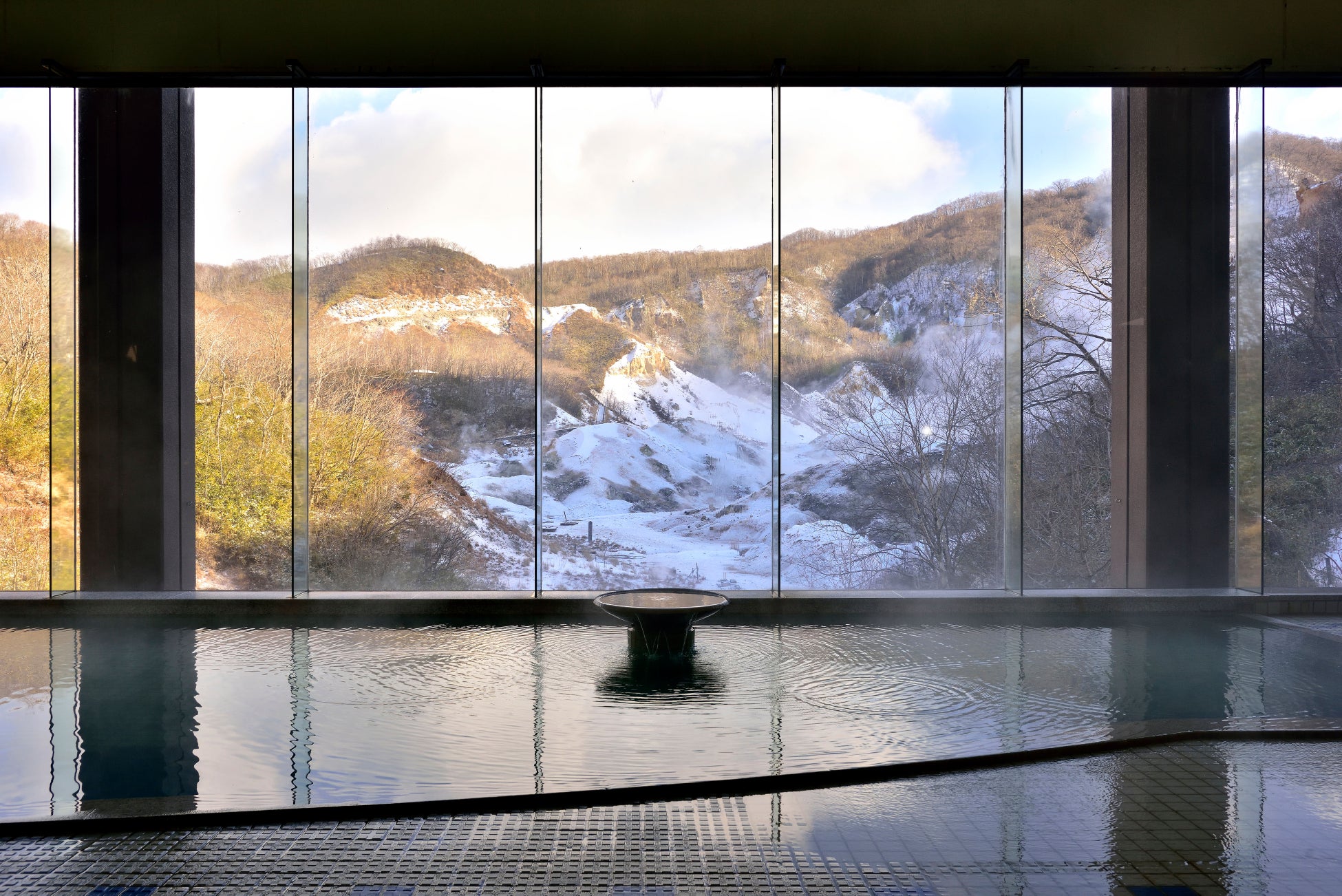 源泉かけ流しの大浴場。硫黄泉、酸性緑ばん泉、重曹泉、芒硝泉、食塩泉の5泉質を一度に堪能できる、何度でも入りたくなる温泉です。