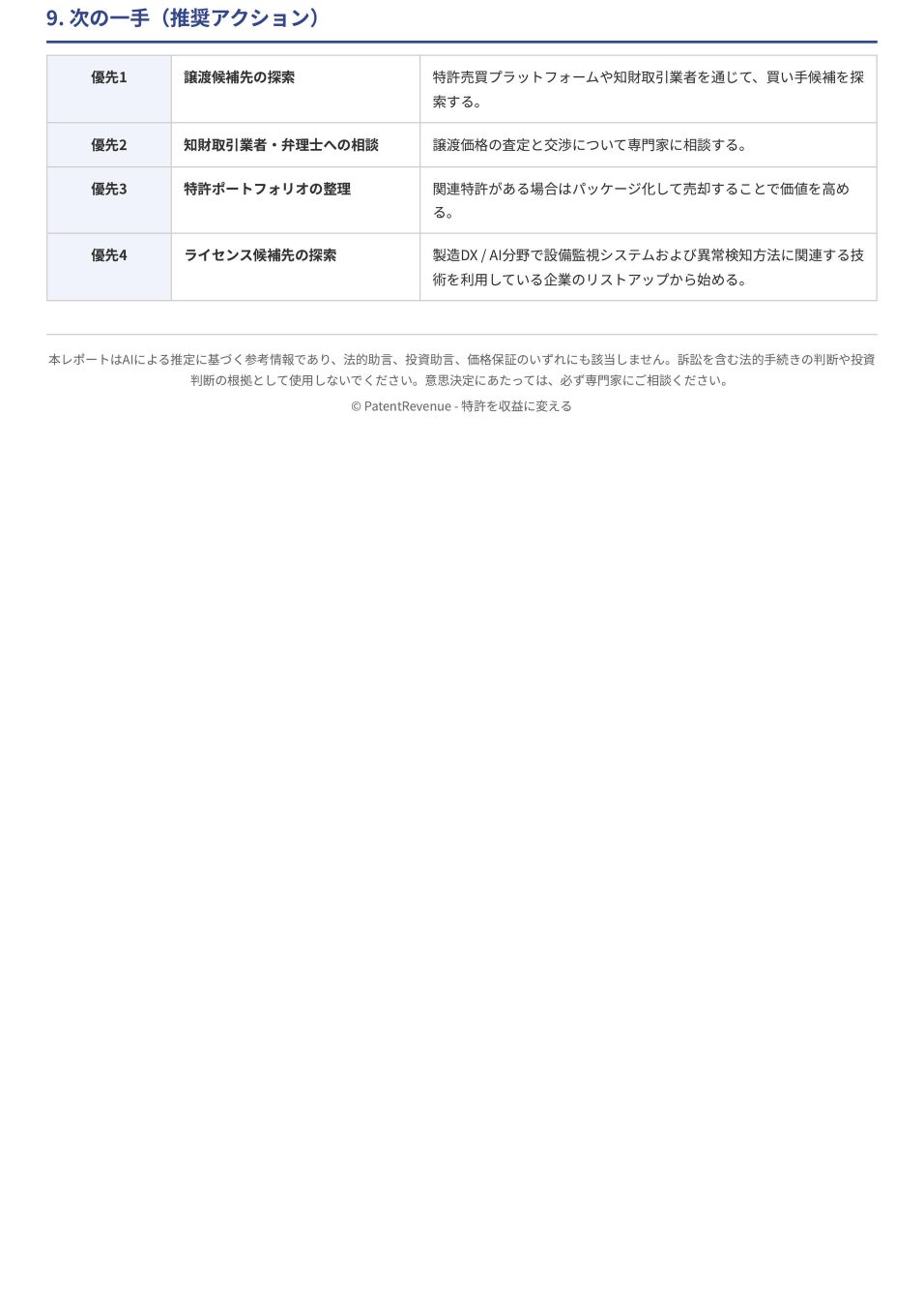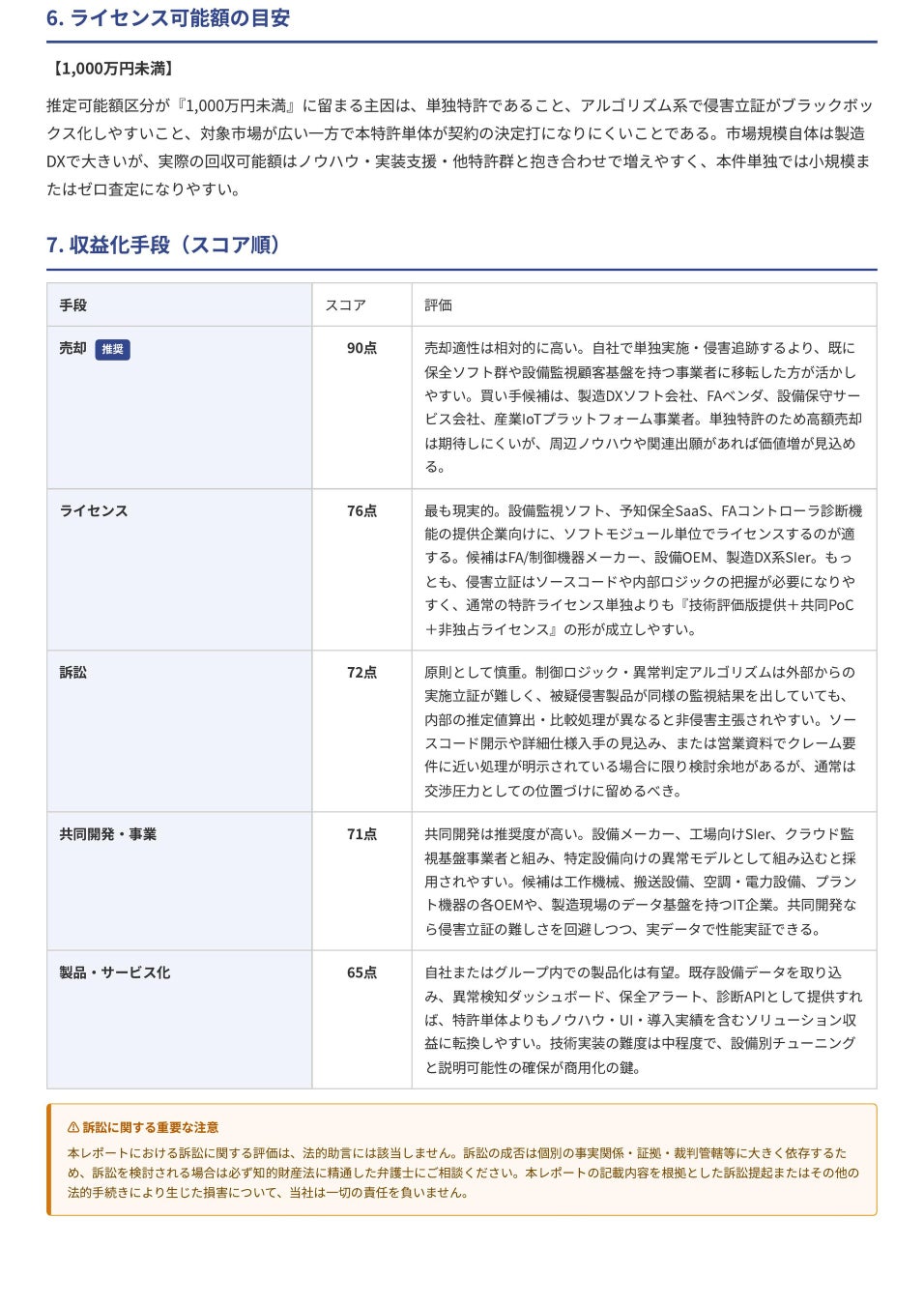 本システムは、弁理士監修の独自の評価基準をもとにした価値算定と最適な収益化手段をAIにより自動で提案するものです。
