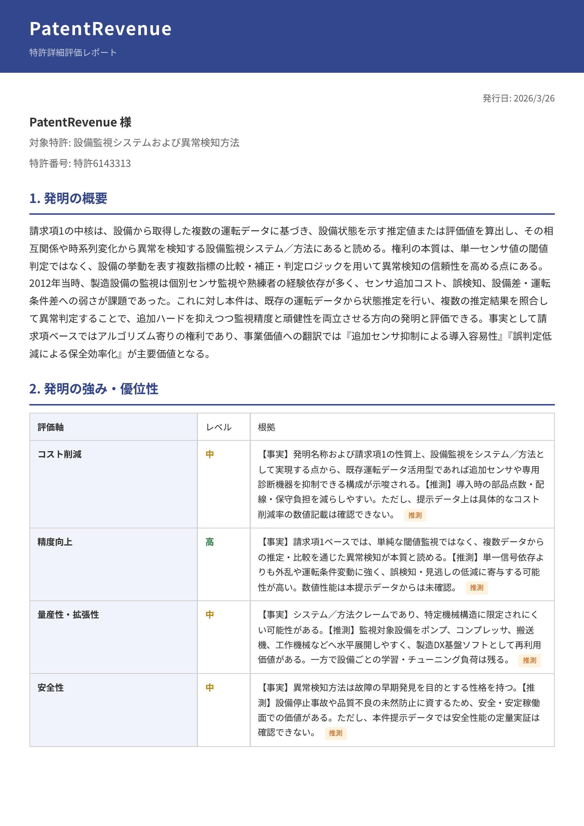 コスト・リスク・独自性などの観点から発明の強みや注意点を分析し、特許の収益化の可能性を示します。