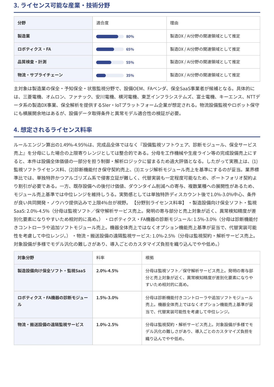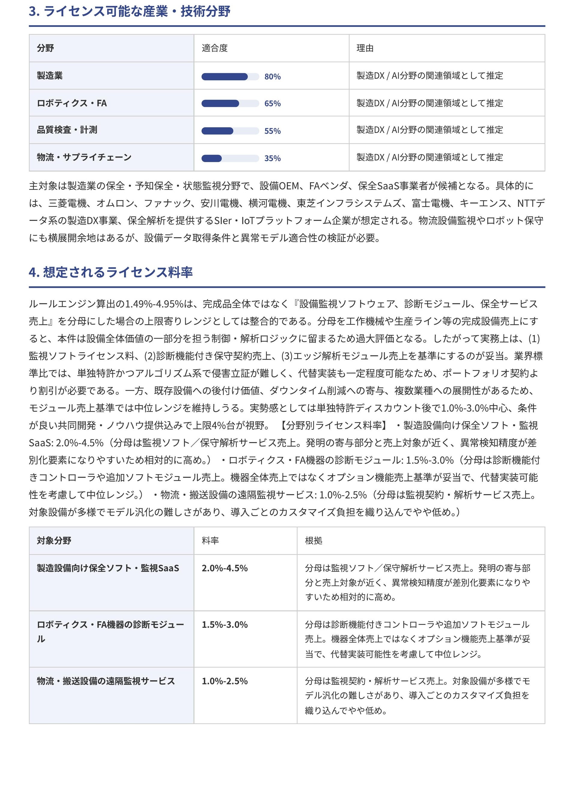 評価を行った各指標について詳しい説明と、想定されるロイヤリティ率や推奨する収益化方法について、スコアを用いての評価を提供します。