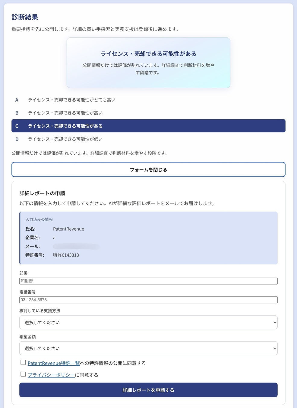 また、PatentRevenue上への特許の登録を行うと、その結論に至った詳細なレポートが届きます。