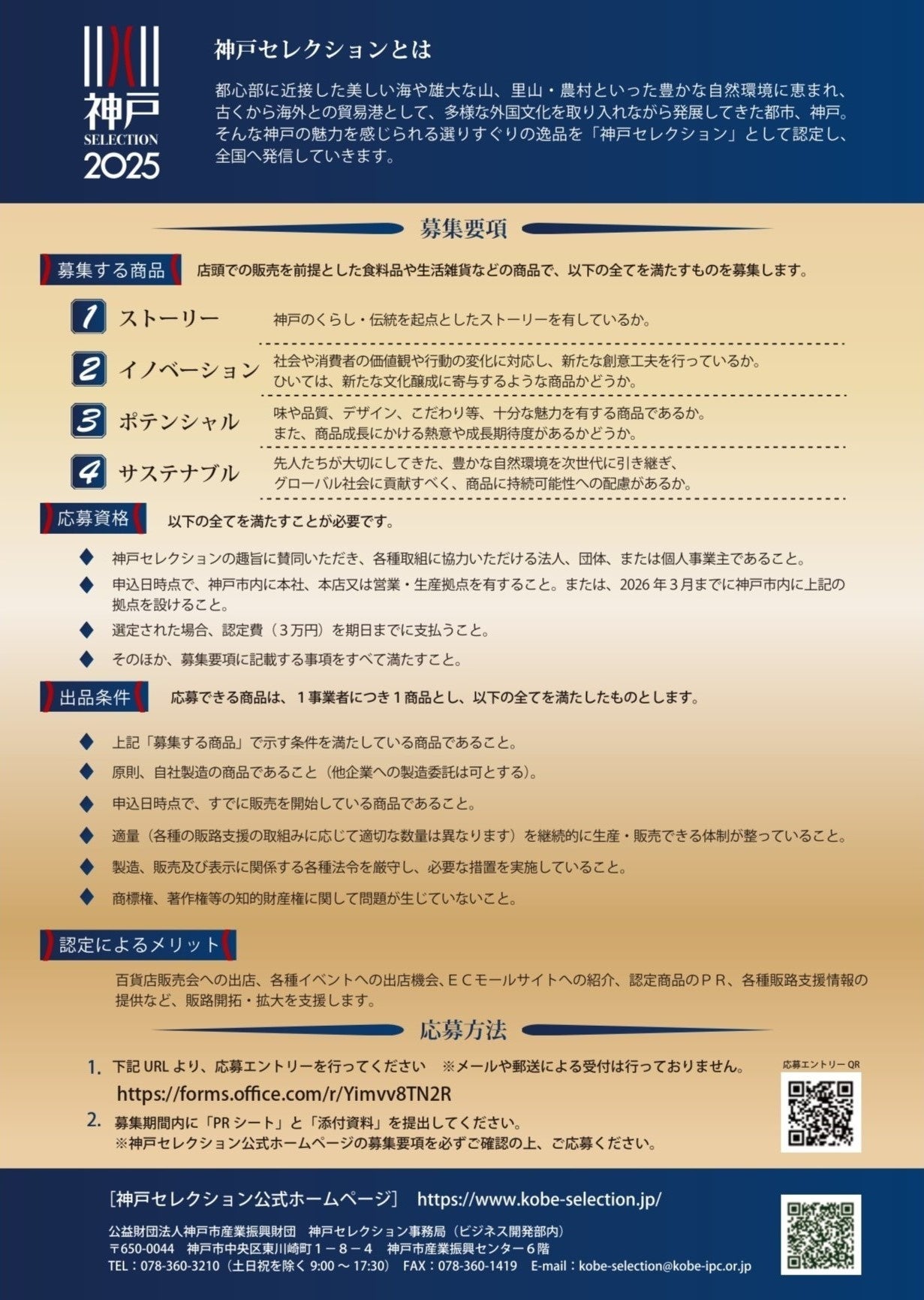 (公財)神戸市産業振興財団では、コロナ禍を経て、募集再開2年目の「神戸セレクション2025」。皆様の魅力ある商品を募集します!