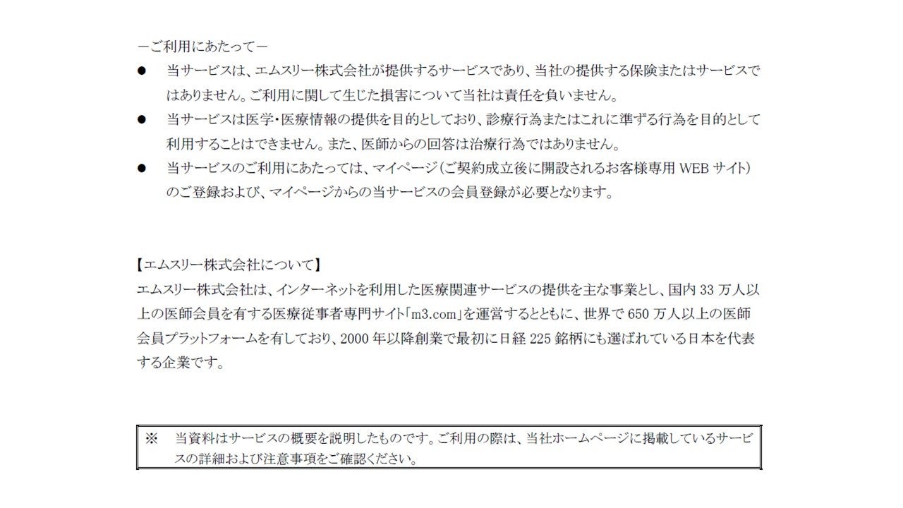 当サービスは、ご自身やご家族の医療・健康上の不安・悩みを、24時間365日、オンラインで医師に相談できるサービスで、当社の商品の契約者様(すでにご加入いただいている方も含みます)は無料でご利用いただけます。