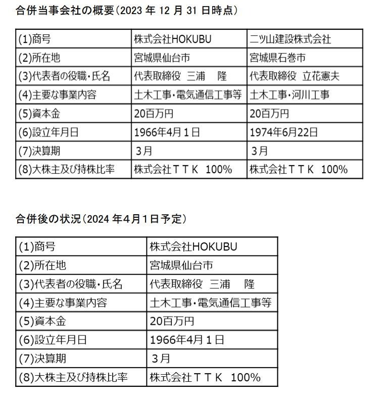 今回の合併は、土木事業を行っている両社の経営基盤の強化、リソース有効活用による事業拡大、収益力の強化を図ることを目的としています。また、HOKUBUを存続会社とし、二ツ山建設を消滅会社とする吸収合併を行います。なお、本合併は、TTK100%子会社同士の合併であるため、新株式の交付は行わない無対価による合併方式とします。