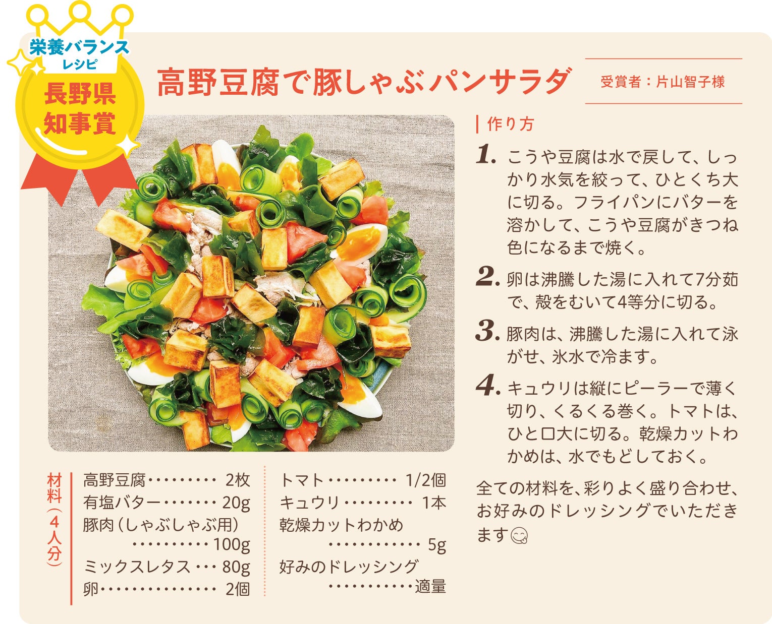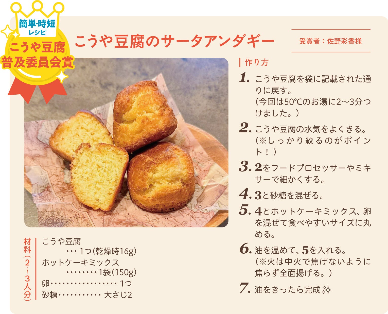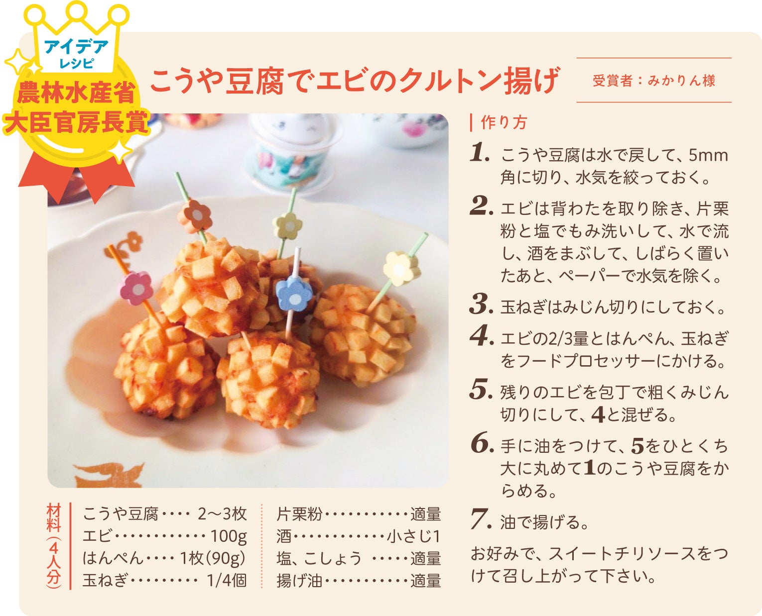 農林水産省大臣官房長賞、長野県知事賞、こうや豆腐普及委員会賞を受賞されたレシピは、それぞれのテーマの趣旨に沿った優れたレシピであり、食材としての「こうや豆腐」の魅力を存分に引き出しています。改めて、多くの方にご応募いただき、心より感謝いたします。