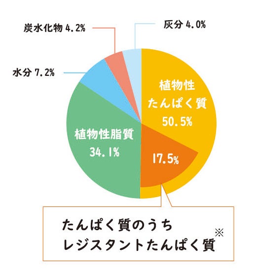 ※レジスタントたんぱく質とは、体内の酵素でも消化されにくく、食物繊維のような働きをするたんぱく質のことです。腸内で胆汁酸と結合し、ともに排出されるため、余分なコレステロールを減少させると考えられています。
