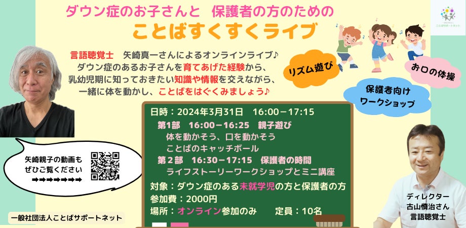 一般社団法人ことばサポートネットは、2024年3月31日(日)、ダウン症のお子さんとその保護者の方を対象としたオンラインイベント、「ダウン症のお子さんと保護者の方のための ことばすくすくライブ♪」を開催しました。