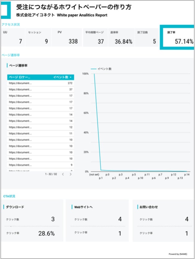 別途、お渡しする分析ページURLは、Lookerstudioで作成されており、ホワイトペーパーの閲覧状況、資料ダウンロードの行動、お問い合わせに至るまでの顧客行動を詳細に可視化します。