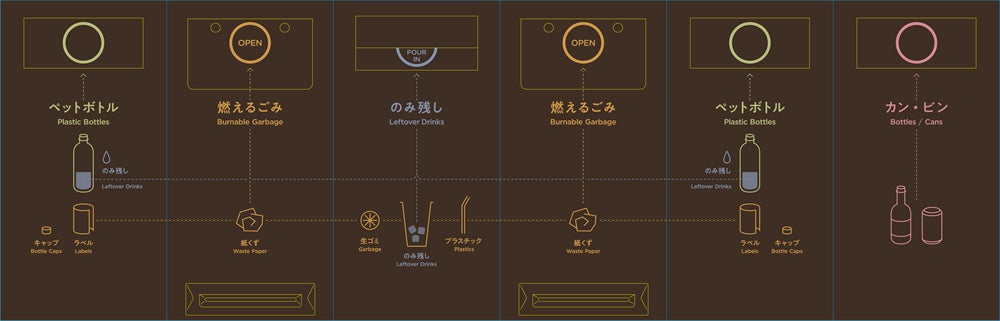 我々、全国清涼飲料連合会が連携し、BIPROGYが研究を進めているナッジ(注1)や仕掛学(注2)、インフォグラフィックス(注3)を活用したデザインで、「SmaGO」をラッピングしています。カテゴリーごとの色分けや、矢印を辿るゲーム性、注目を集めやすい丸い形状などで、ついごみや飲料容器を分別したくなるよう行動変容を促し、ごみの分別や飲料容器のリサイクルを促進します。ペットボトルについては、3分別や飲み残しの適切な処理を促すデザインを追記することで、リサイクルの取組を促進します。また、景観と調和したシンプルでスマートなデザインを採用しています。