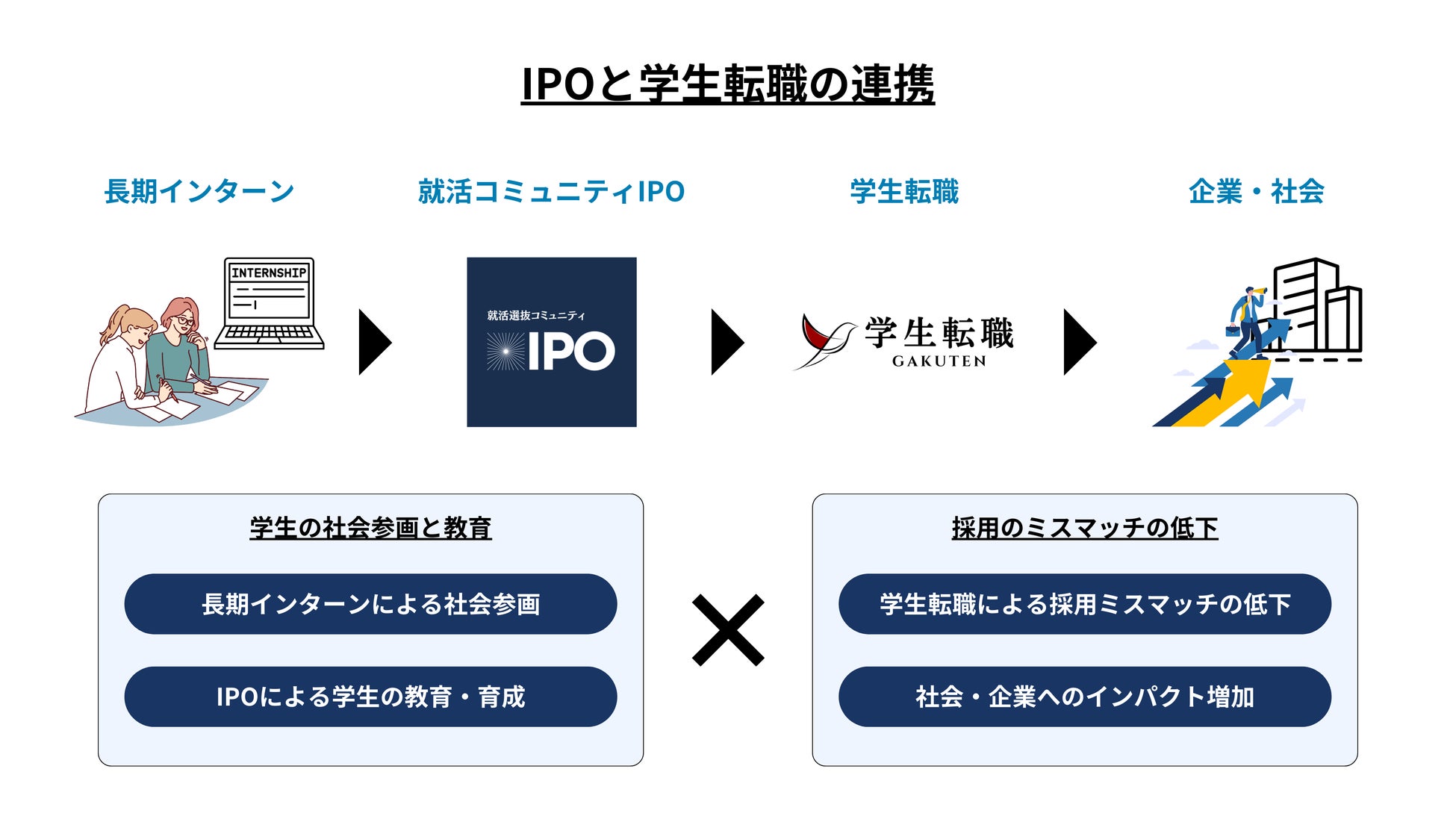 このたびIPOと学生転職が連携することで、長期インターン → IPOコミュニティでの実力養成 → 学生転職を通じた企業からのスカウト → 社会でのキャリア構築という一気通貫の支援が実現します。学生にとっては、IPOで培った実務スキルやキャリア意識を武器に、社会人の中途採用に近い形での就職活動が可能となります。企業にとっても、IPOで選抜された優秀な学生に対して直接アプローチできるため、採用のミスマッチを減らしつつ将来の即戦力人材を確保できる新たなチャネルとなります。特に、新しい採用手法に関心の高い企業や、若手のうちから将来の幹部候補を育成したい企業にとって、大きなメリットがある取り組みと言えます。