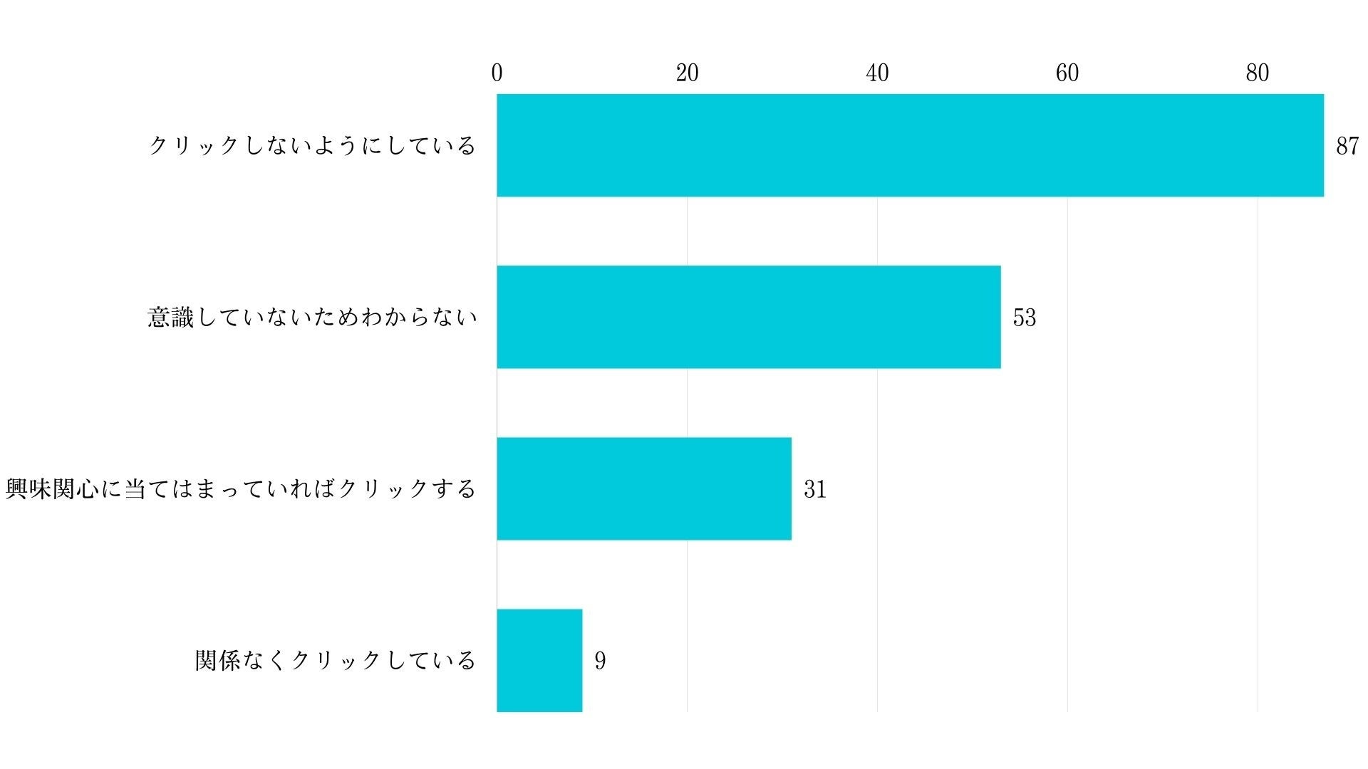 「クリックしないようにしている」が48%と最も高い結果となった。反対に、「関係なくクリックしている」と回答した人は5%とかなり低い結果となった。
