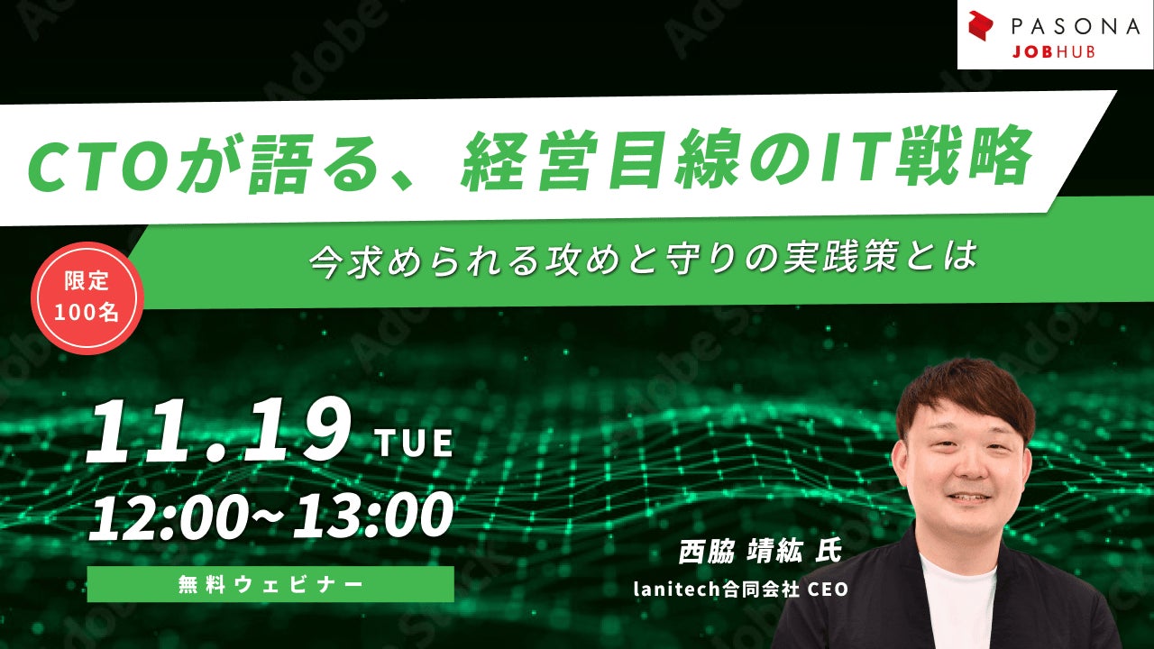 「テクノロジーで、持続可能な明るい未来社会をつくる」を掲げるlanitech合同会社(代表取締役CEO:西脇靖紘)の代表西脇は、2024年11月19日(火)12時~13時 パソナJOB HUB セミナー「CTOが語る、経営目線のIT戦略~今求められる攻めと守りの実践策とは~」にて登壇することをお知らせいたします。ぜひIT戦略をお考えのみなさま、ご参加ください。