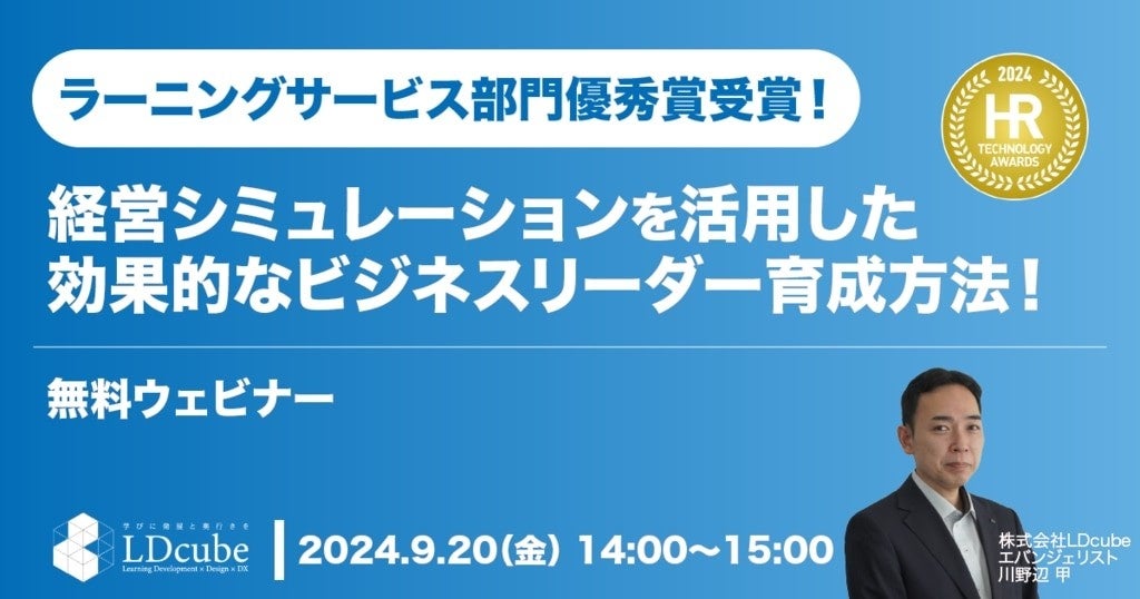 研修のスタイルにとらわれない企業向け人材育成サービスを提供する株式会社LDcube(本社:東京都千代田区、代表取締役社長:新井澄人、以下「当社」)は、「HRテクノロジー大賞」実行委員会が主催する「第9回HRテクノロジー大賞」において「ラーニングサービス部門優秀賞」を受賞したことを受け、受賞したサービス「Biz-Ex」について、「経営シミュレーションを活用した効果的なビジネスリーダー育成方法!」と題して無料ウェビナーを開催することをお知らせします。