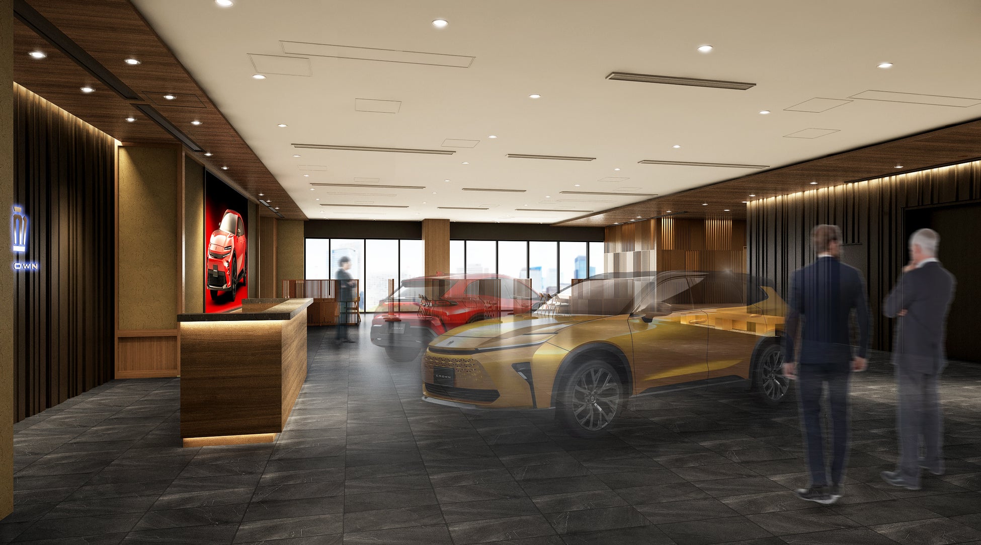 この虎ノ門は旧東京トヨペット株式会社の発祥の地であり、ちょうど70年前の1955年1月7日に初代トヨペット・クラウンの発表会が開催された、歴史と伝統の場所で、新たにクラウンを中心に人と人が交わり、様々な賑わいや交流が生まれるような空間づくりとお客様に喜ばれる一流のおもてなしを追い求める店舗を目指す。